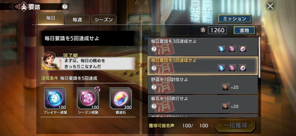 プレイヤーレベルについては、現段階では要請をこなすことで上げることができています。毎日発生する要請は「野盗を1回討伐せよ」、「登用を1回実行せよ」という内容になっており、非常に簡単です。