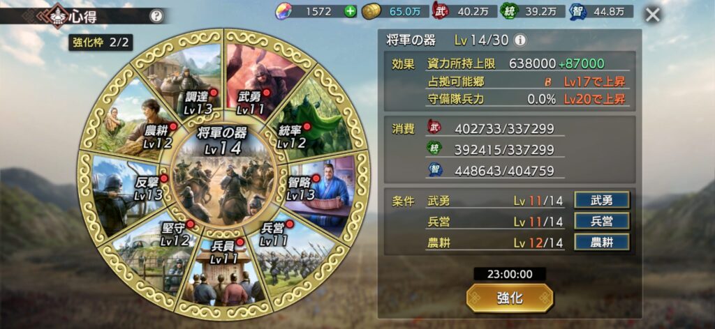 Step3の将軍の器Lv.14は、「武、統、智」ポイントを産出する郷を占拠して、2時間ごとに調達を繰り返す必要があるので、意外と面倒な案件です。