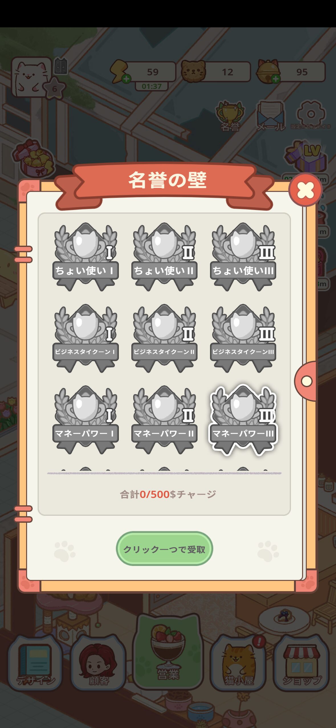 | ⑭ | 名誉の壁で「ビジネスタイクーンⅠ」の実績獲得 | 50$チャージ | 課金 |