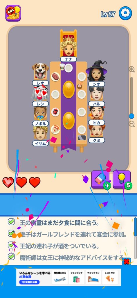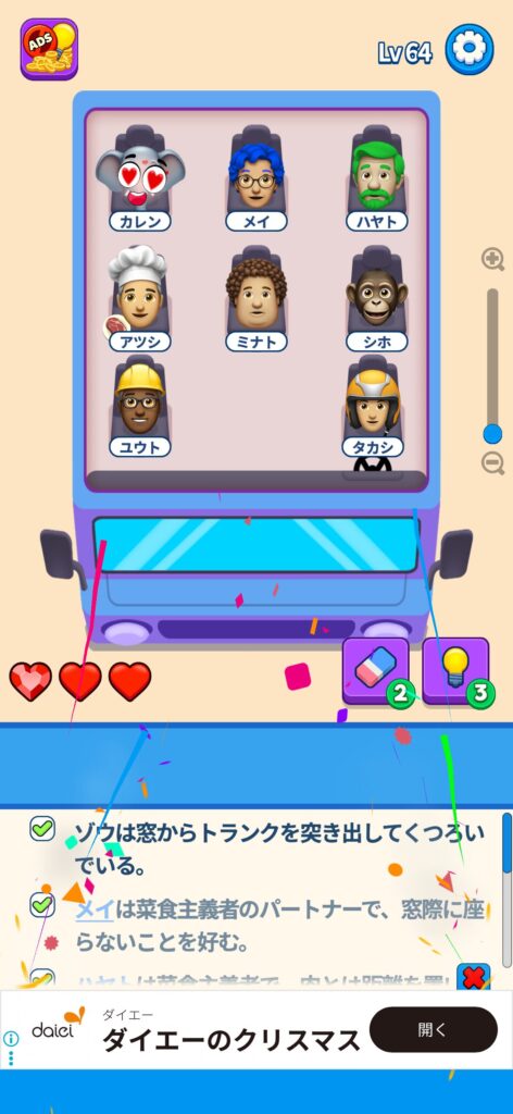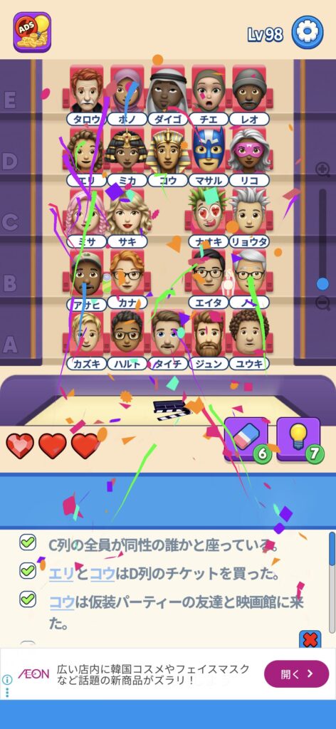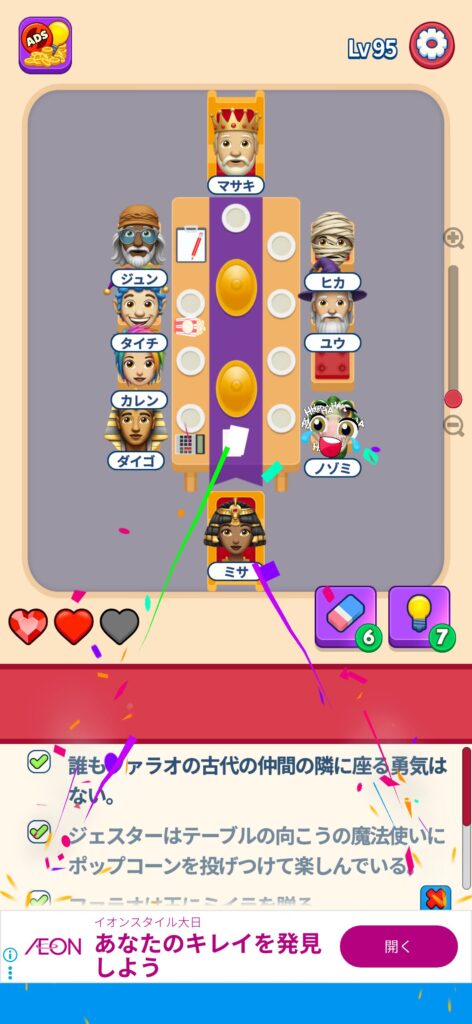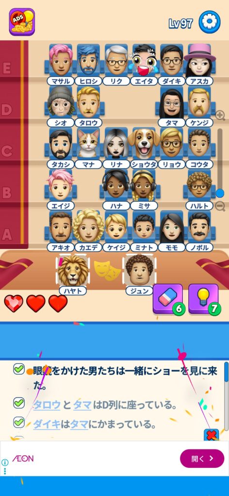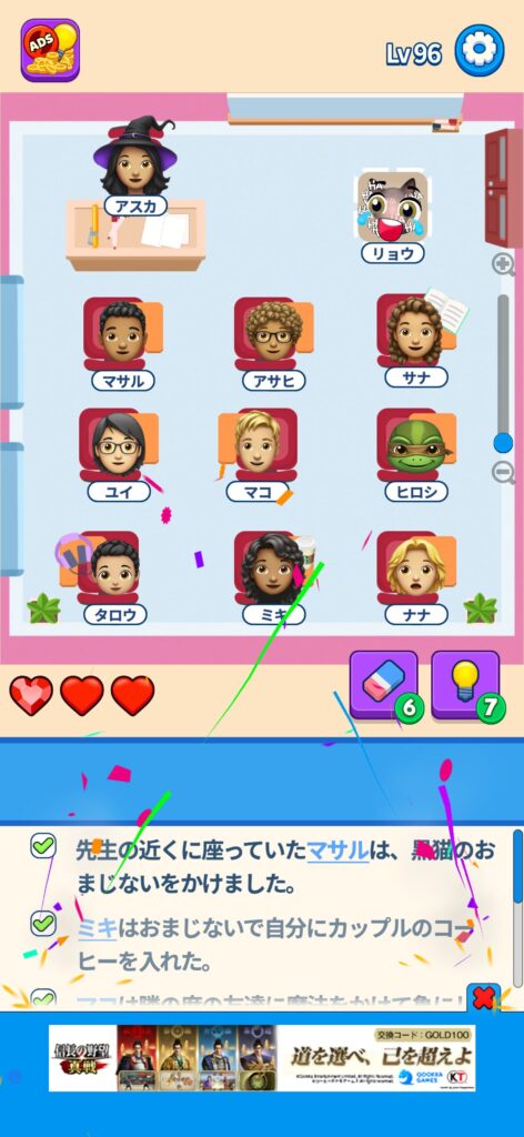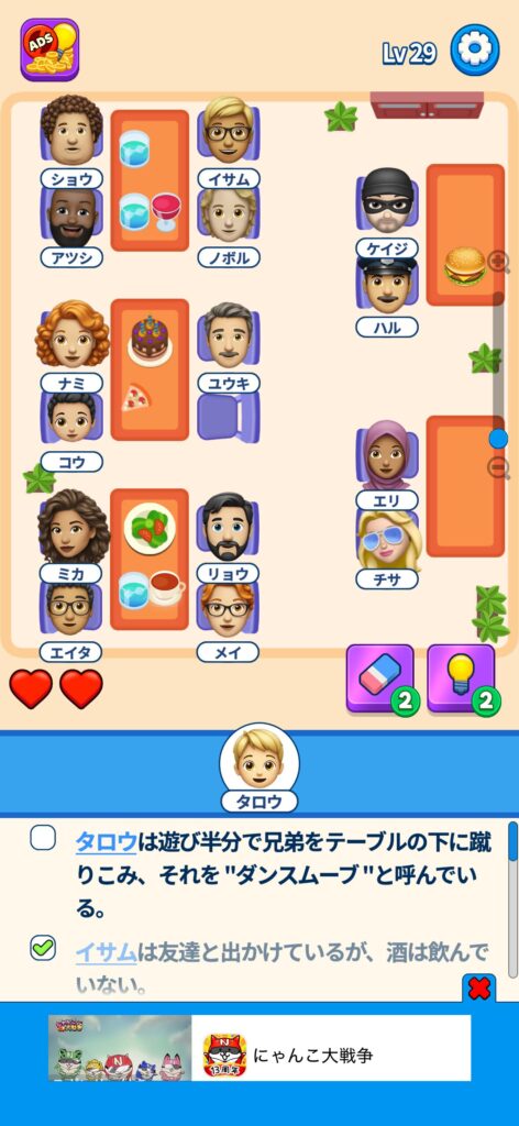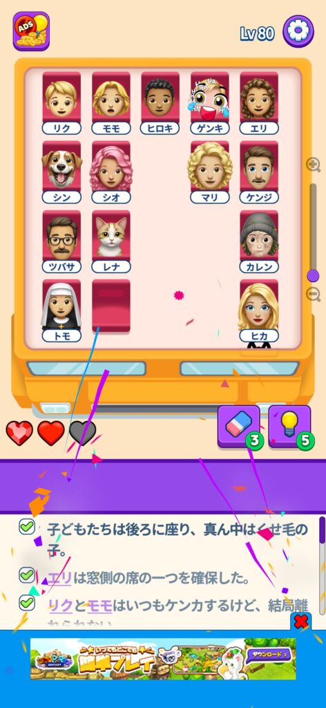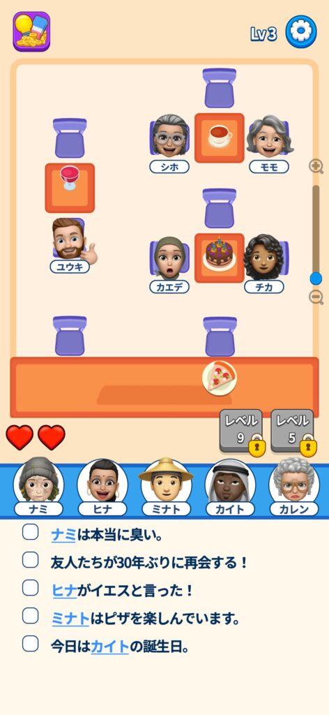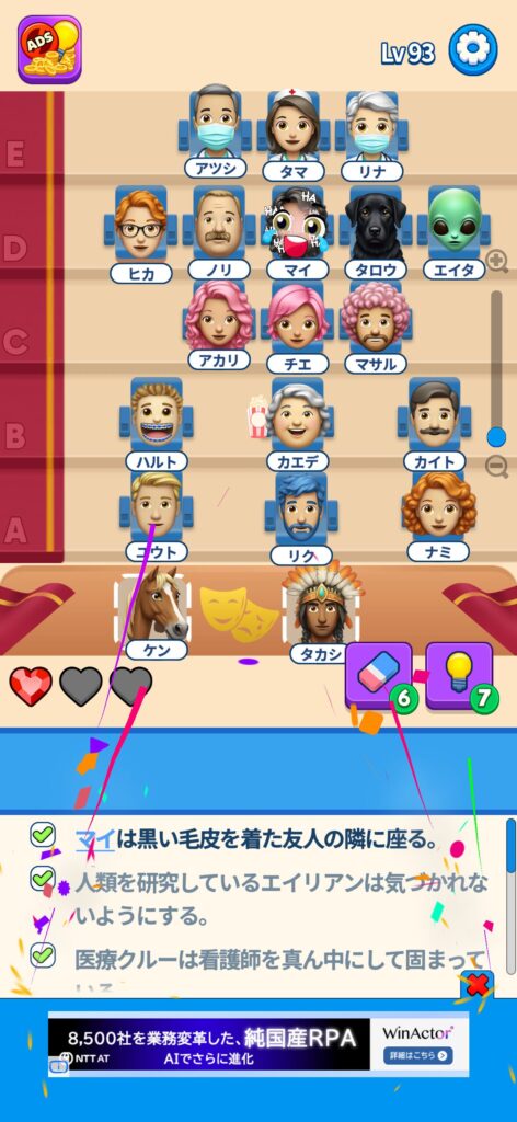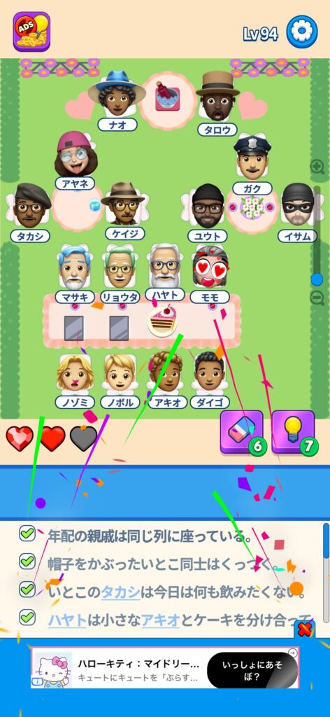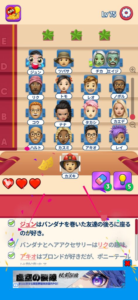 ヒントをもとにキャラクターを正しい席へ配置していく