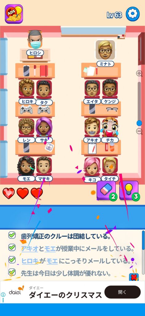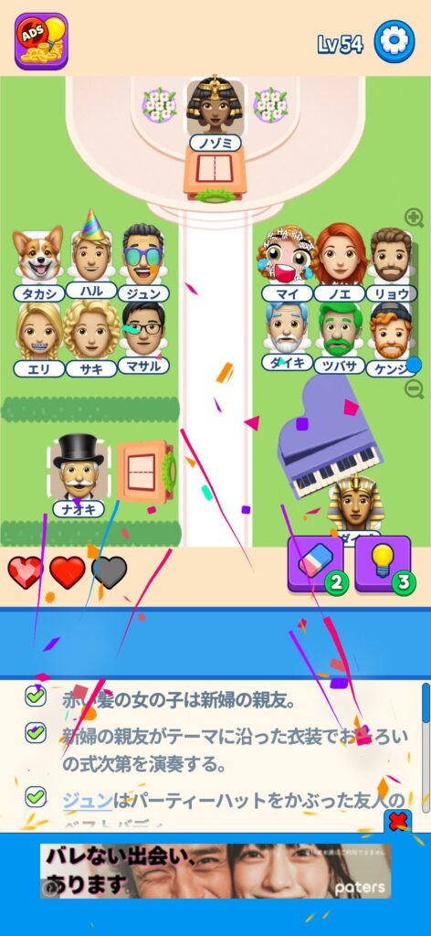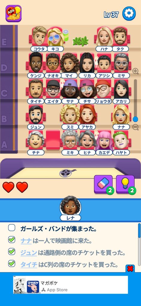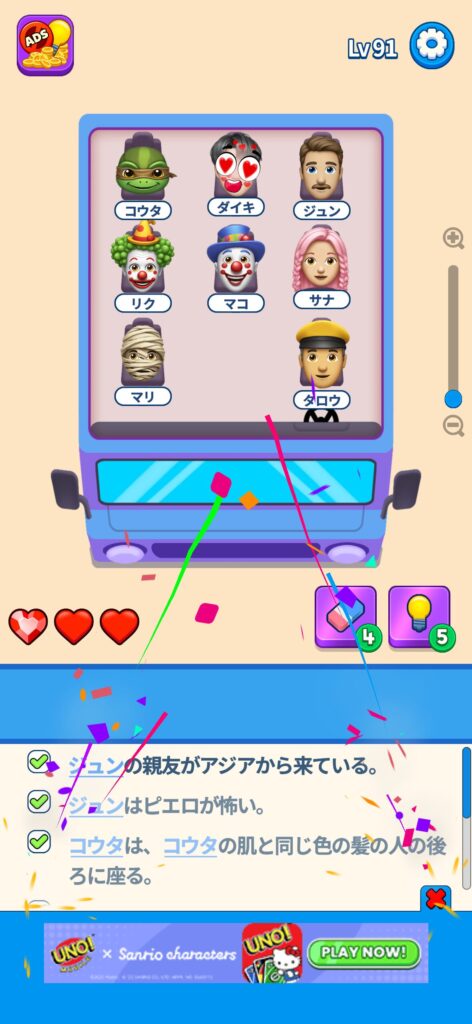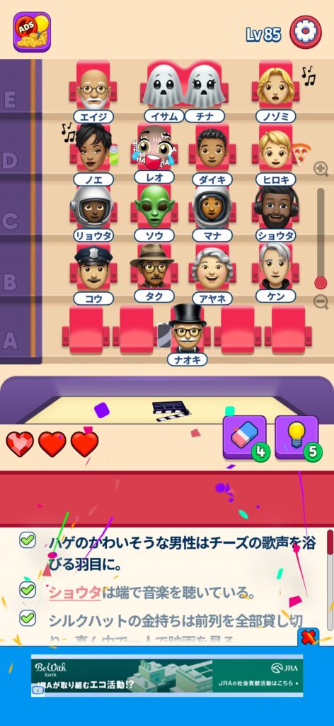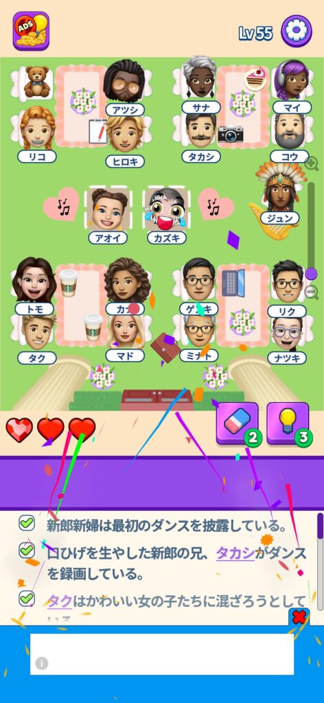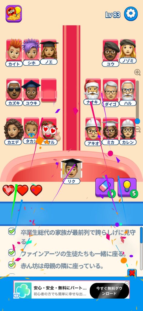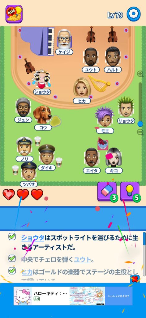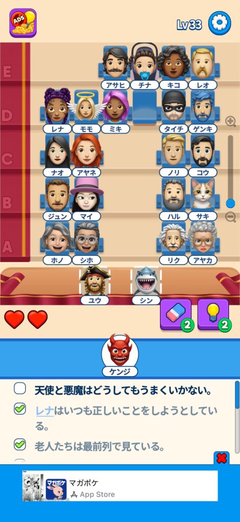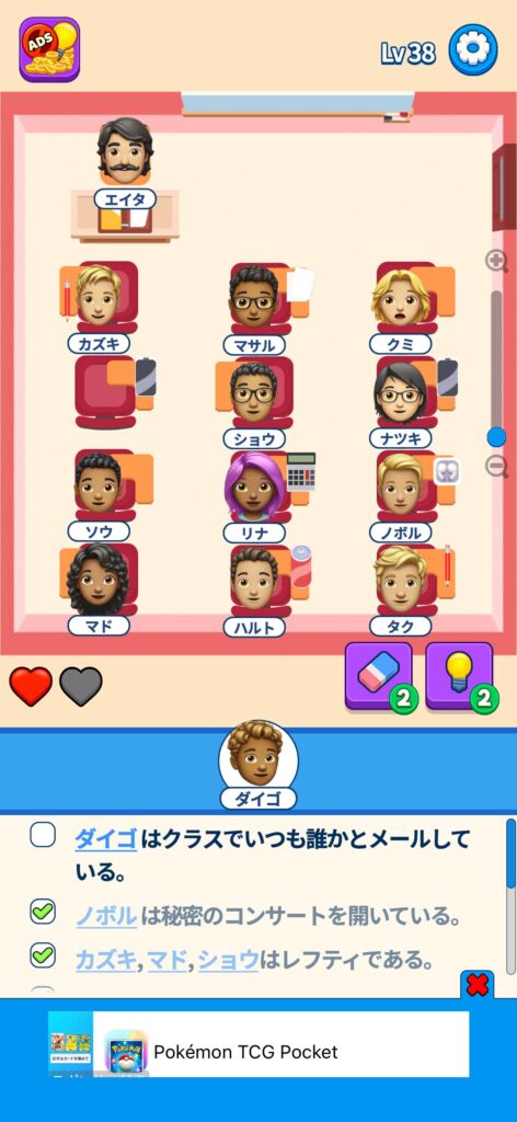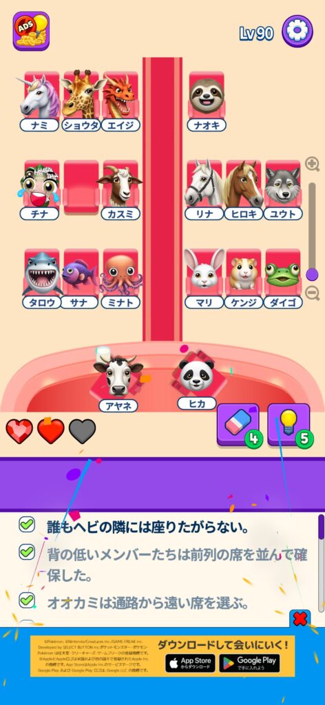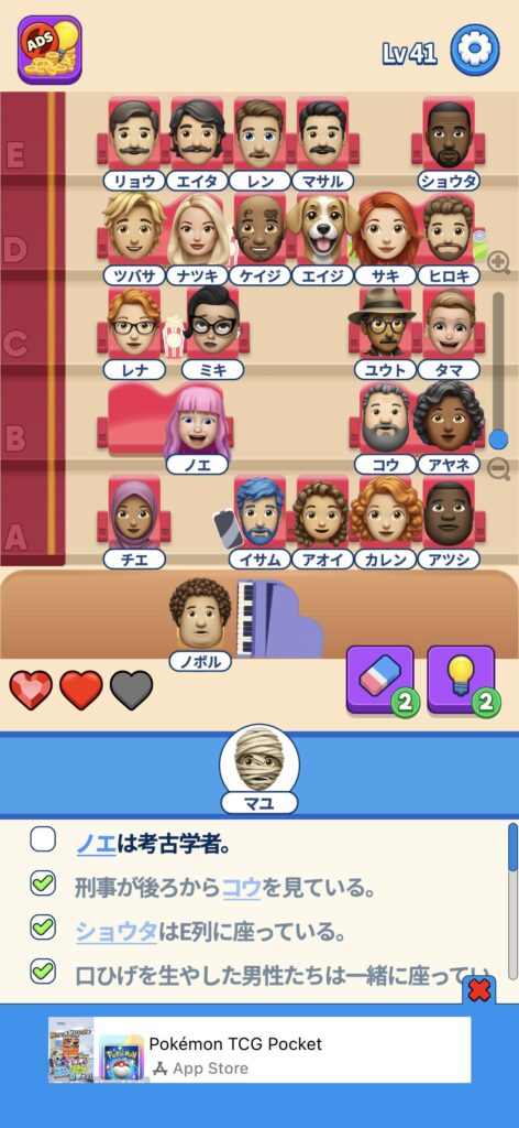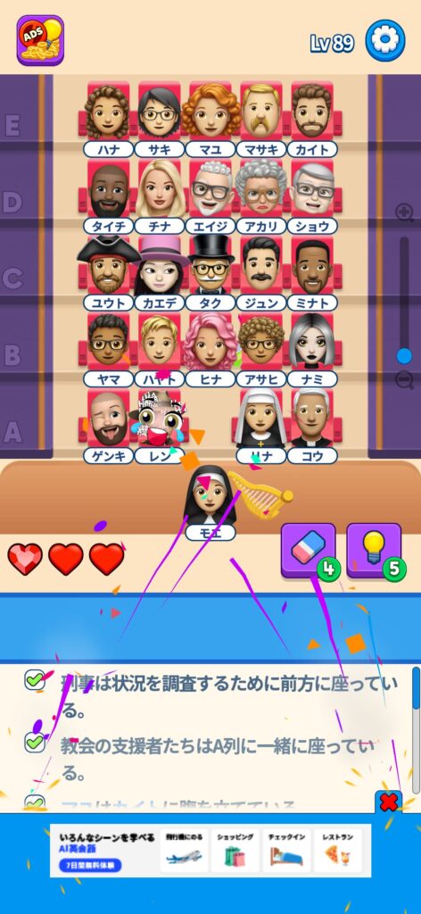 ヒントをもとにキャラクターを正しい席へ配置していく