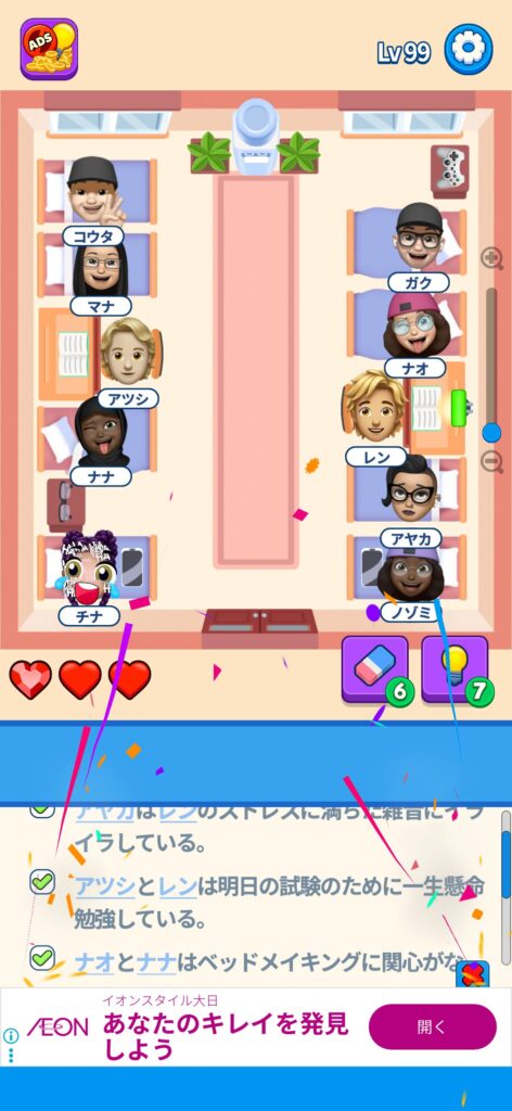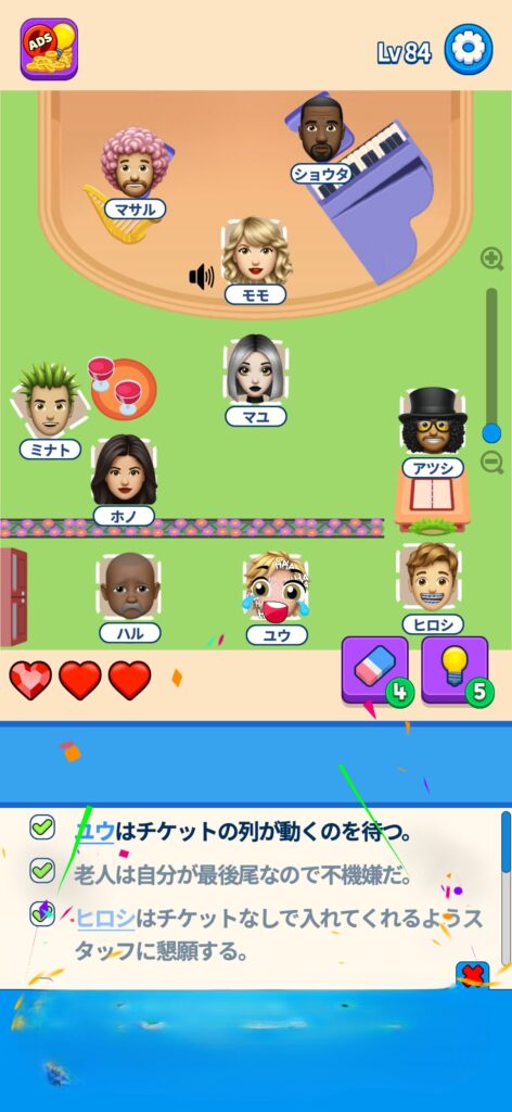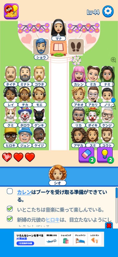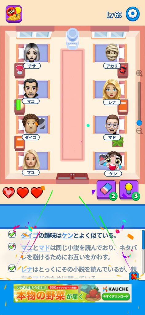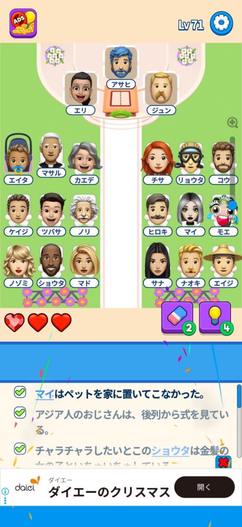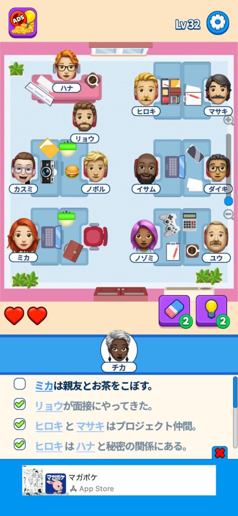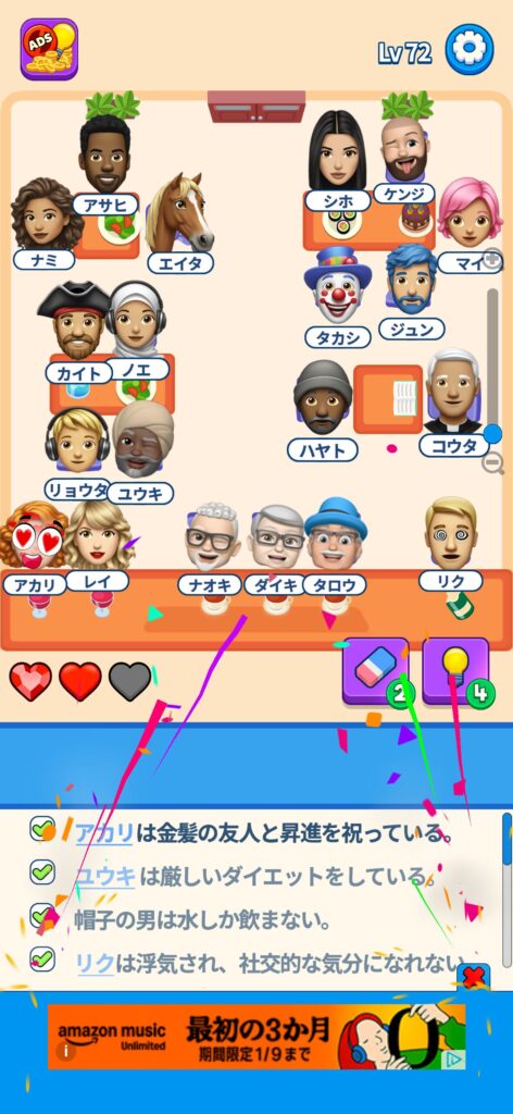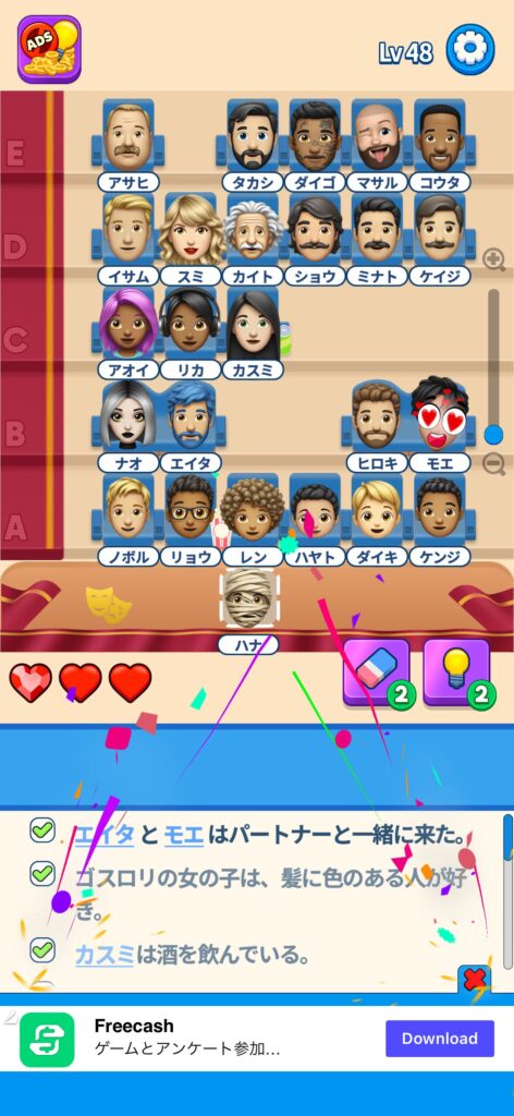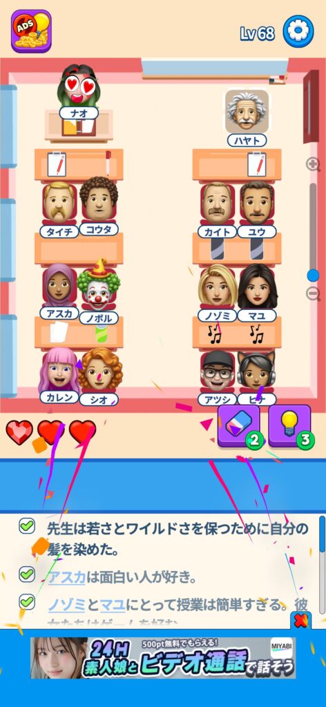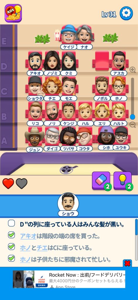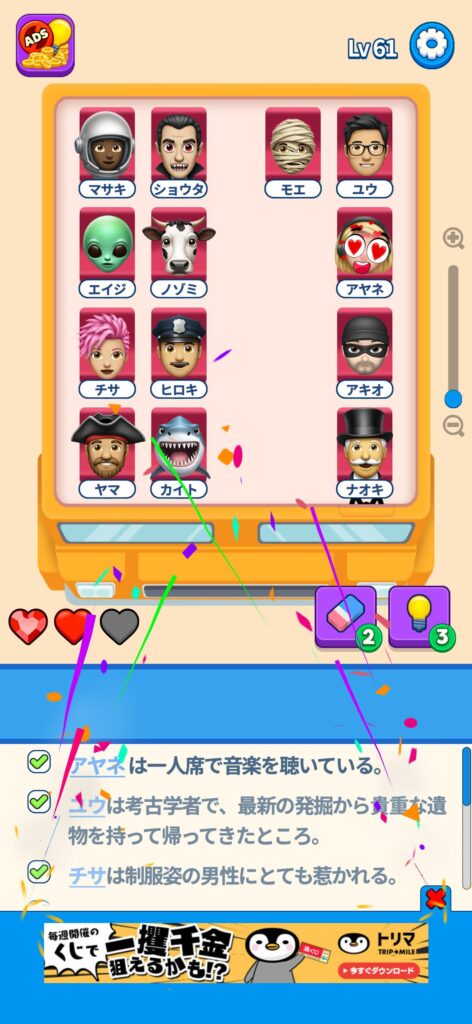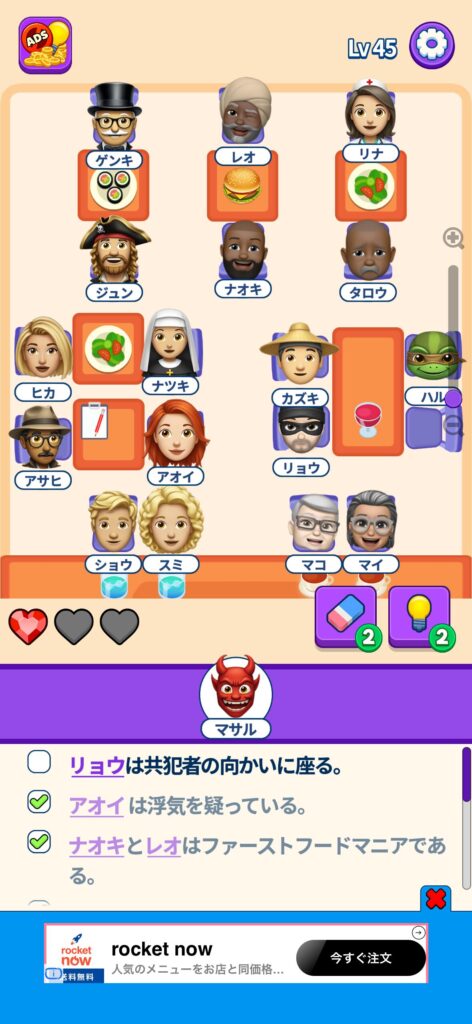 ヒントをもとにキャラクターを正しい席へ配置していく