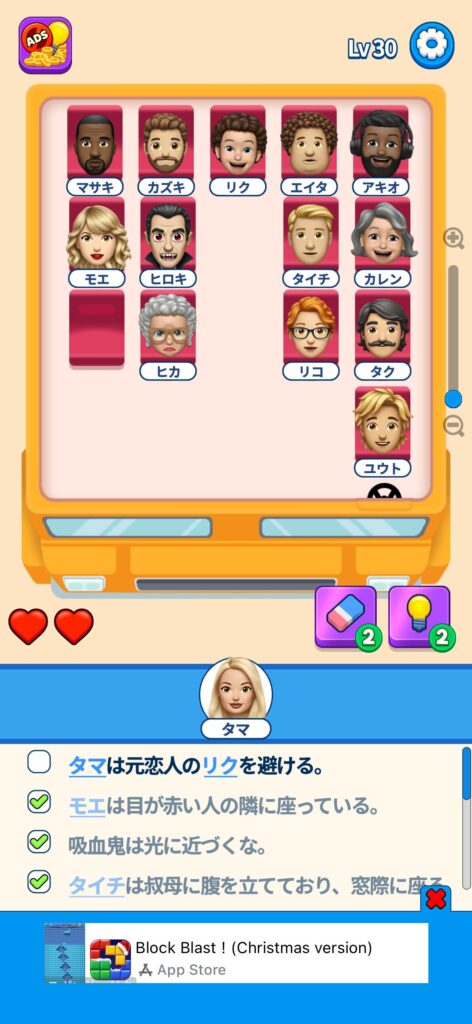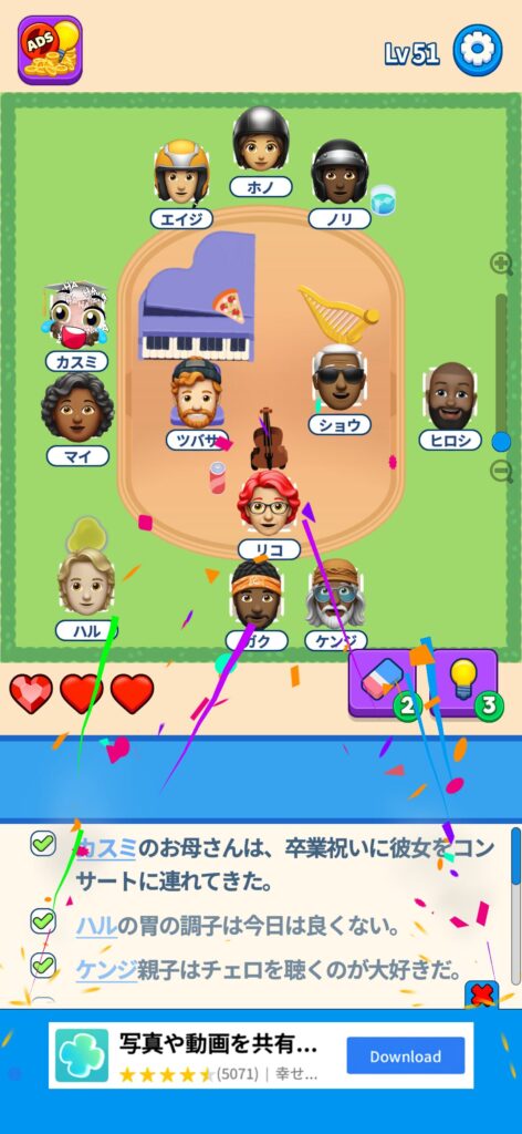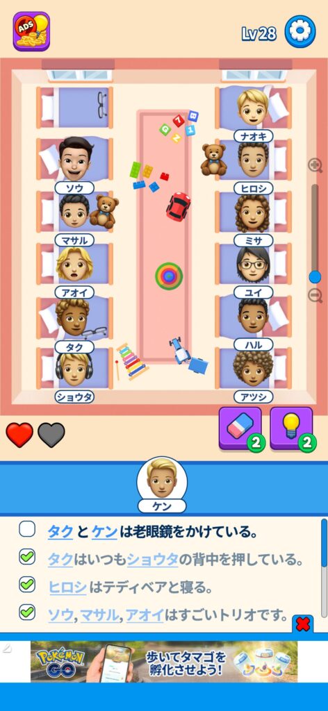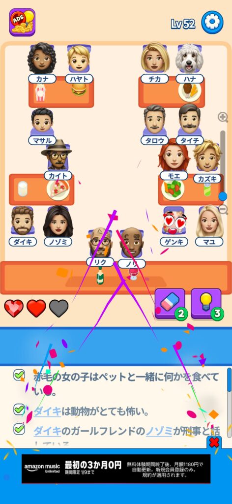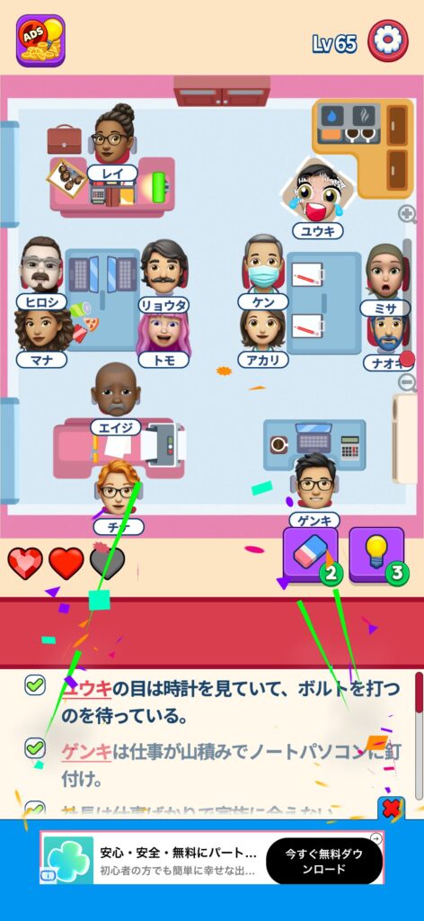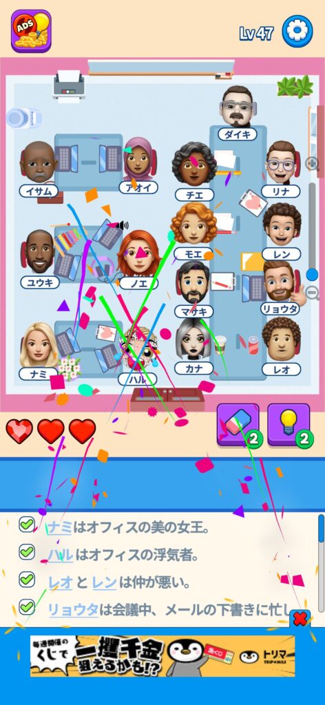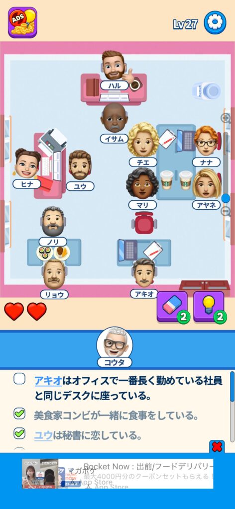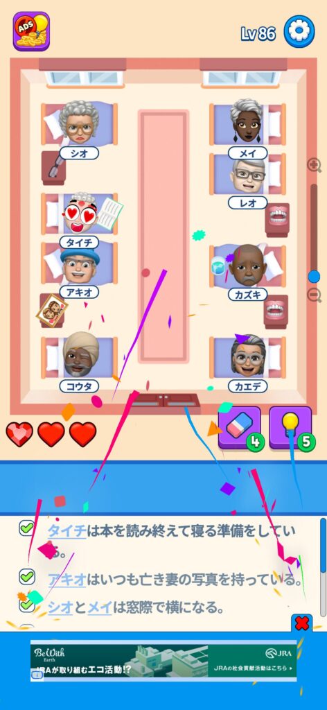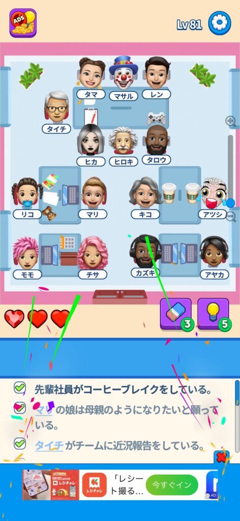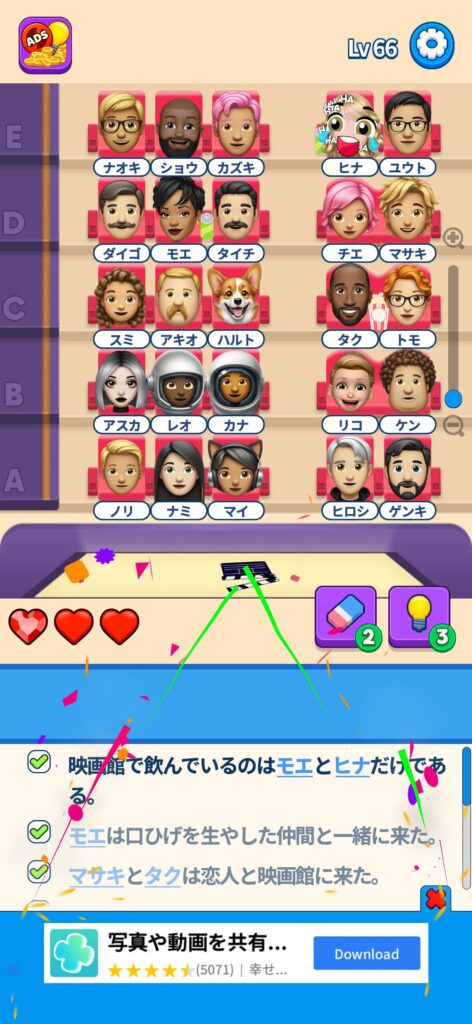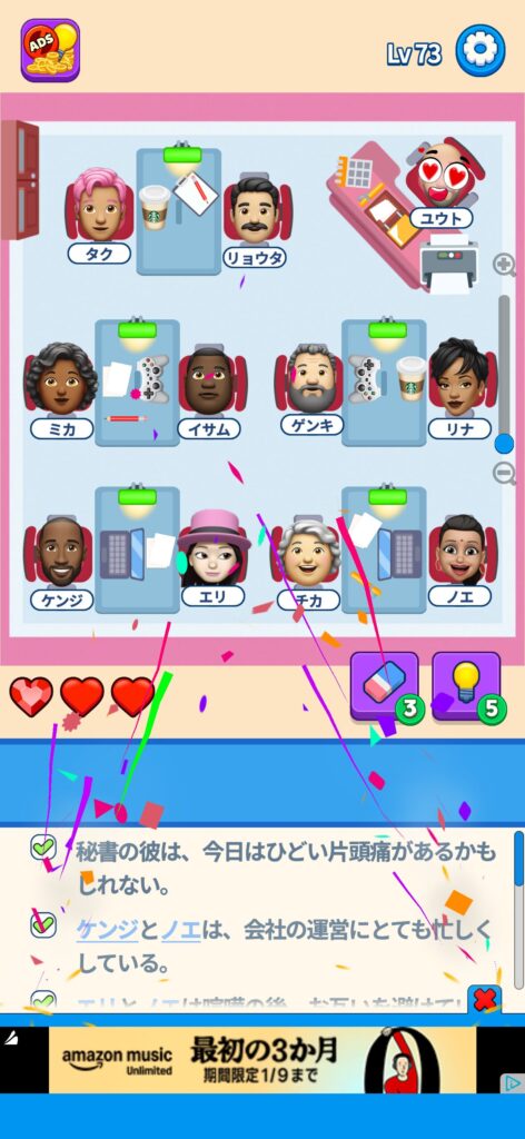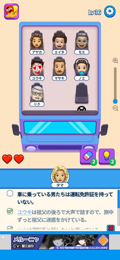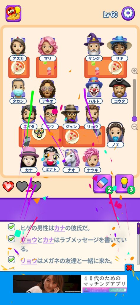 ヒントをもとにキャラクターを正しい席へ配置していく