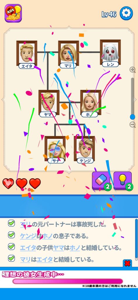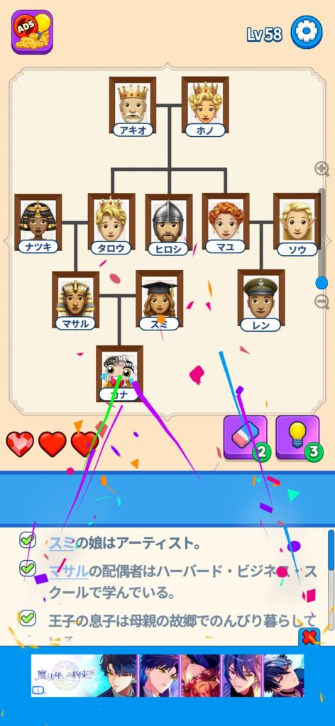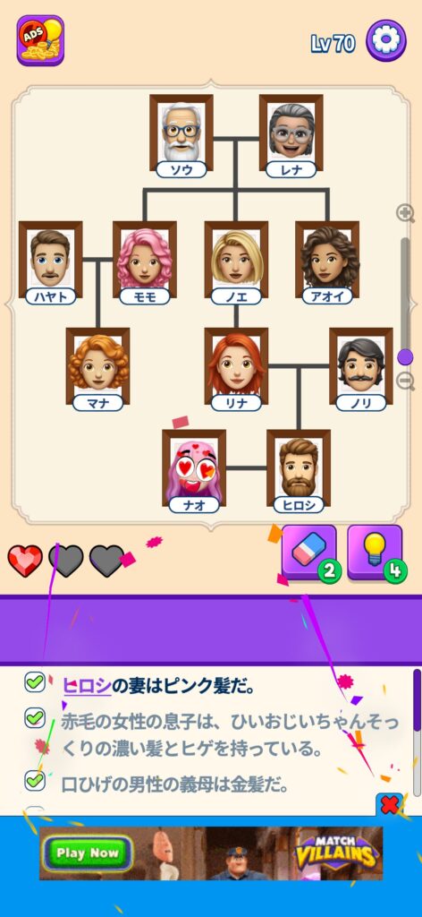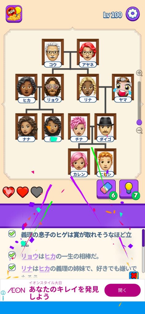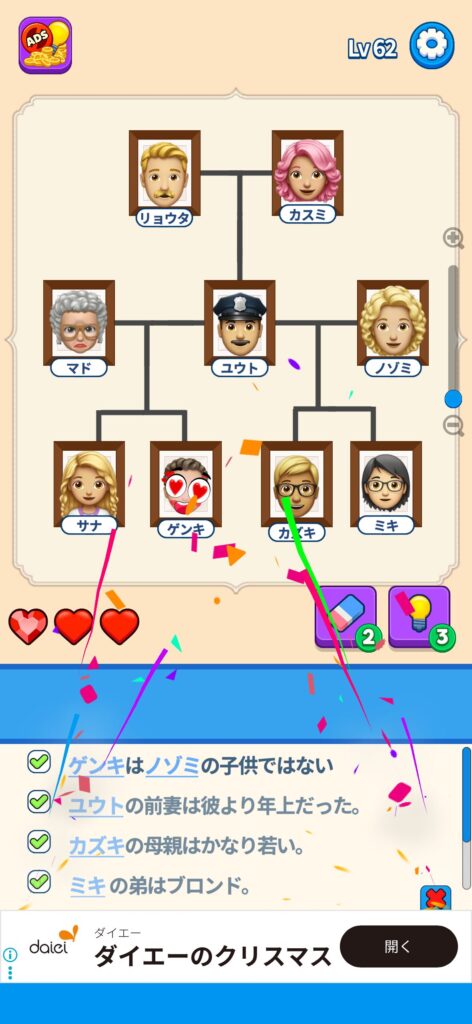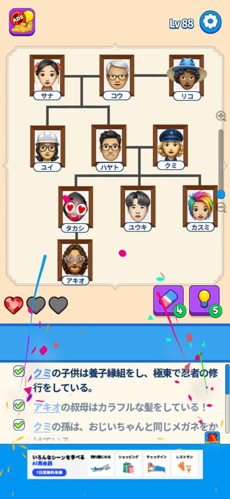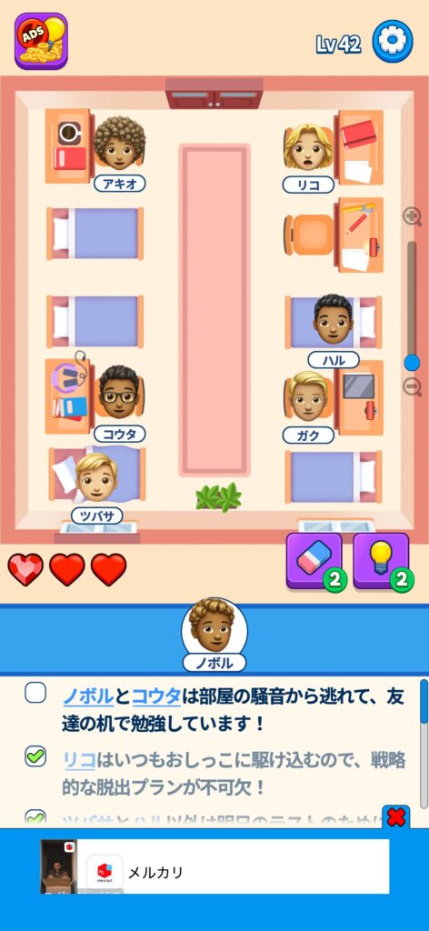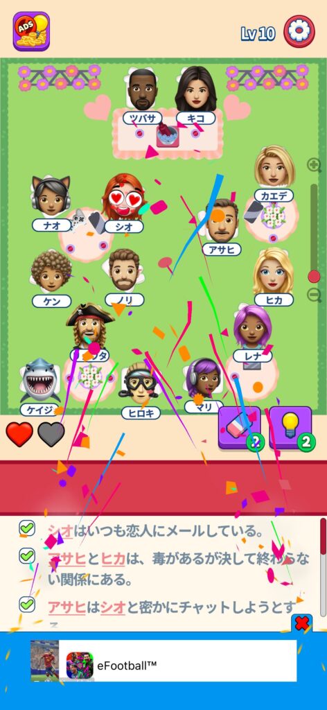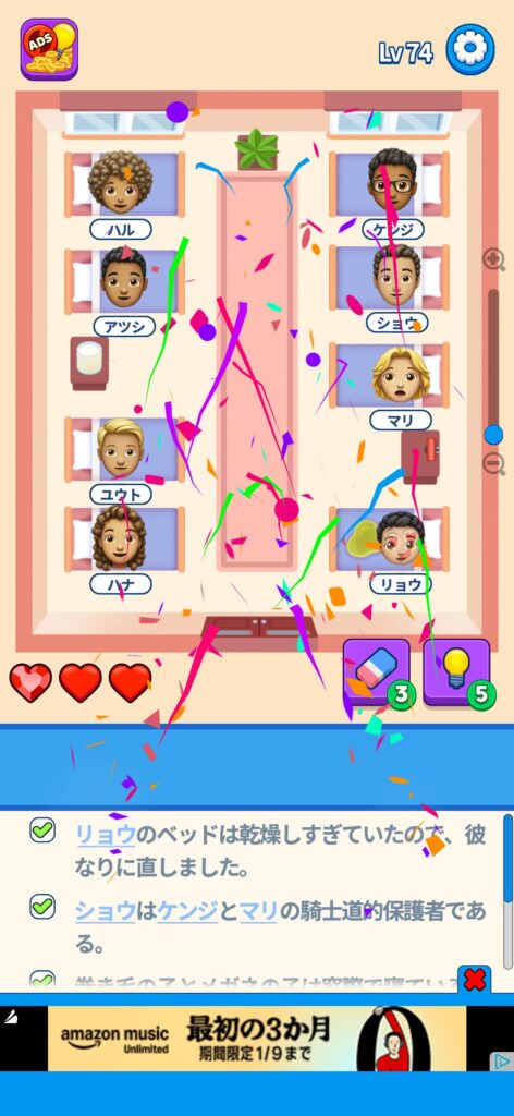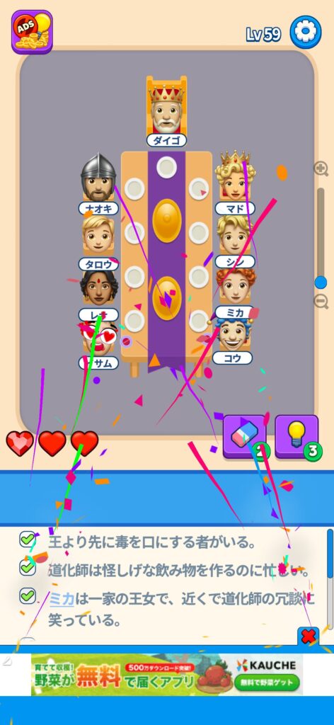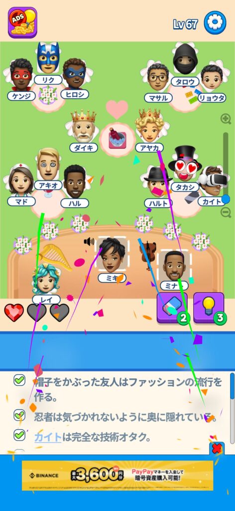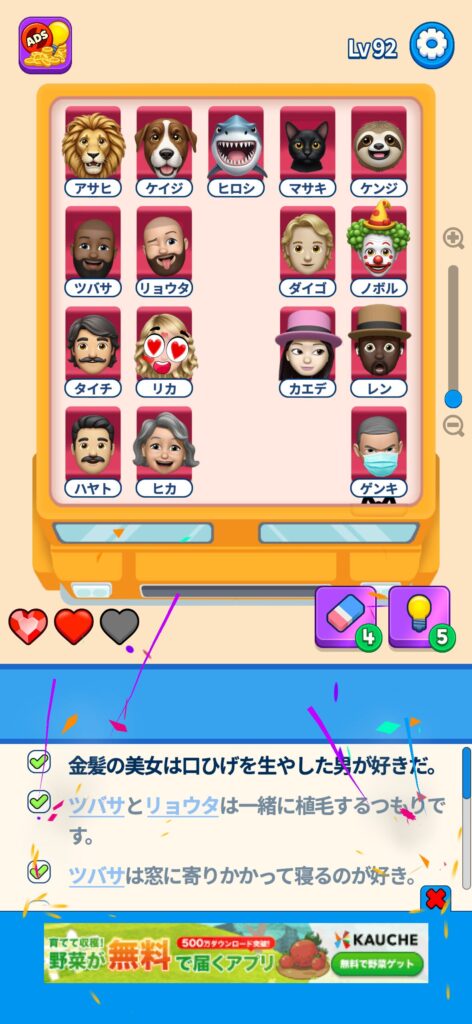 ヒントをもとにキャラクターを正しい席へ配置していく