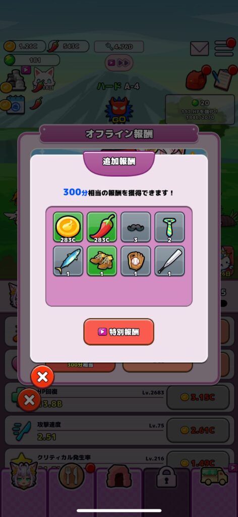 右上の「オフライン報酬」ボタンからは、動画視聴で300分分の報酬を受け取れます。