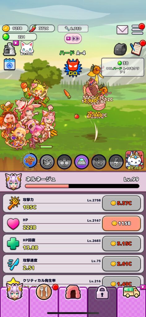 ポイ活の達成条件であるネルネージュのレベル400は、攻撃力・HP・HP回復といったステータス強化時に得られる経験値で上げていくことになります。スライム伝説のように、ステージ○○をクリアという案件ではないため、時間をかけてステータス強化用のゴールドを集めていくことになります。