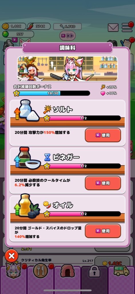 戦闘画面左上の「調味料」ボタンをタップすると、動画視聴によって一時的なバフ(攻撃力強化・必殺技のクールタイム短縮・ゴールド増加)が得られます。