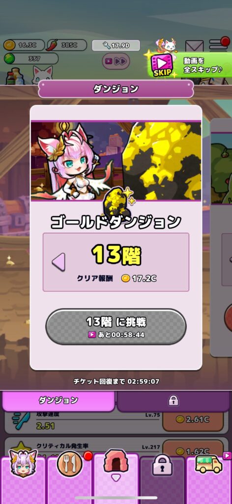 1日2回無料で挑戦できるダンジョンでは、ゴールド・スパイス・ダイヤを獲得可能。動画視聴で+1回追加挑戦できるため、忘れずにプレイしておきましょう。