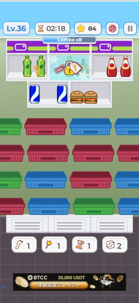Lv.50までに、カゴが画面左右に移動するステージは多く登場しますが、棚だけでなくカゴに商品を3つ揃えても商品は消失するため、棚が多くなったと考えれば、通常のステージよりも簡単にクリアすることが可能です。