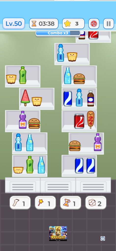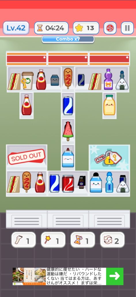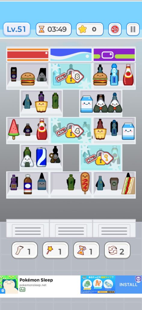 下画像のように商品が一つ配置された棚は、後列の商品が見えない場合が多く、商品の消し順を間違えると、商品を移動できなくなりゲームオーバーとなります。ただ、後列の商品が見えない以上、悩んでも仕方ないので気難しく考える必要はないです。