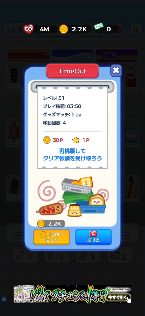 どちらの条件でも、ゴールドを支払うか、動画広告の視聴(1ステージ、1回)で復活することができます。