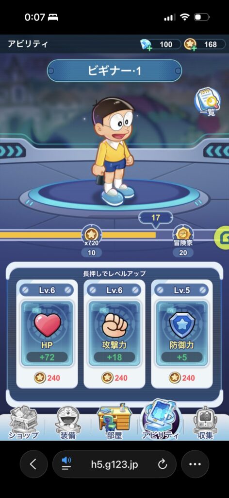 ホーム画面でアビリティを押すと、のび太を育成することができます。スタミナを余らせることの方がもったいないので、ステージには何度も挑戦し、育成に必要なコインを集めましょう。