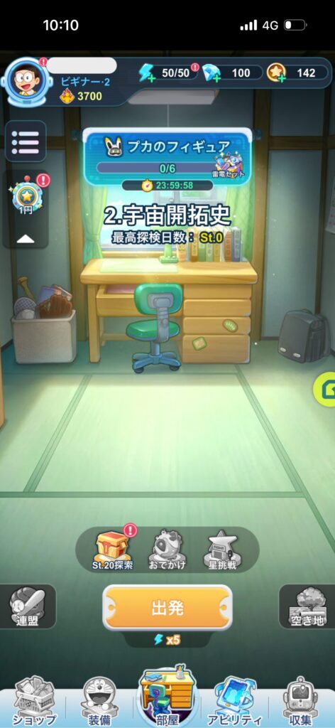 3章をクリアすると「おでかけ」機能が解放されます。この機能は、自動探索をしてくれるので時間がないとき or のび太を短時間で育成したいときに便利です。消費するスタミナは設定できますので、スタミナが余ってしまいそうなときにガンガン使っていきましょう。