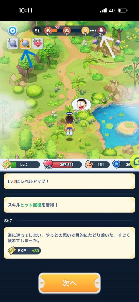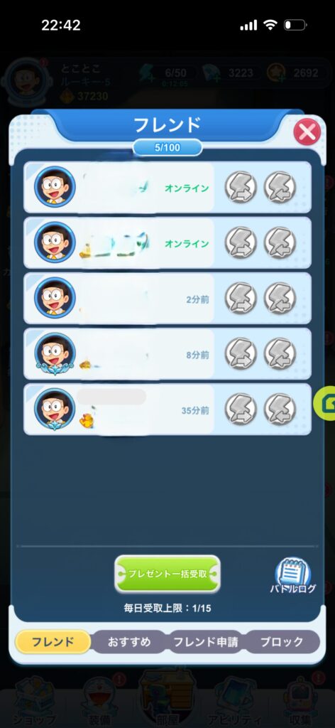 おでかけ機能と併用することで、スタミナを無駄にすることなく、のび太を育成することができます。スタミナを受け取れる上限は15回のようで、毎日30回復することができます(1回につきスタミナは2回復する)