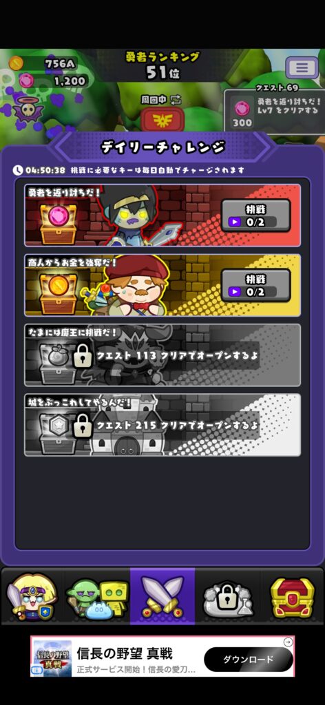 クエストをクリアしていくと、デイリーチャレンジが解放されます。デイリーチャレンジは基本的に毎日2回無料挑戦でき、動画広告の視聴で更に2回挑戦できます。
