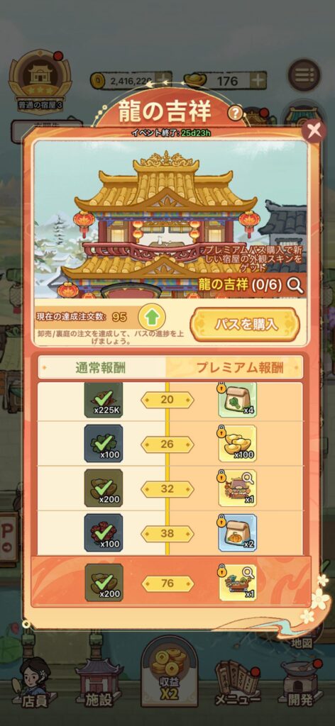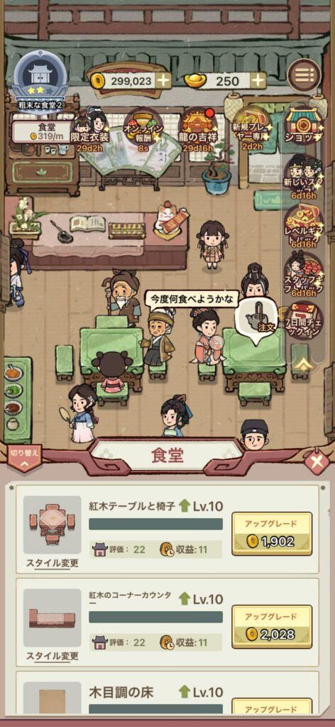 銅貨は接客数が多いほど入手しやすいので、ゲーム開始直後は食堂のテーブル数を増やすようにしましょう。