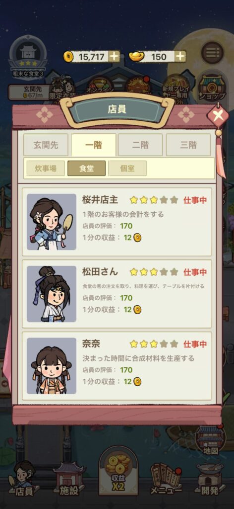 - 元玉とバラを回収し、元玉は店員の雇用のみに使用し、バラでひたすら店員をアップグレードする