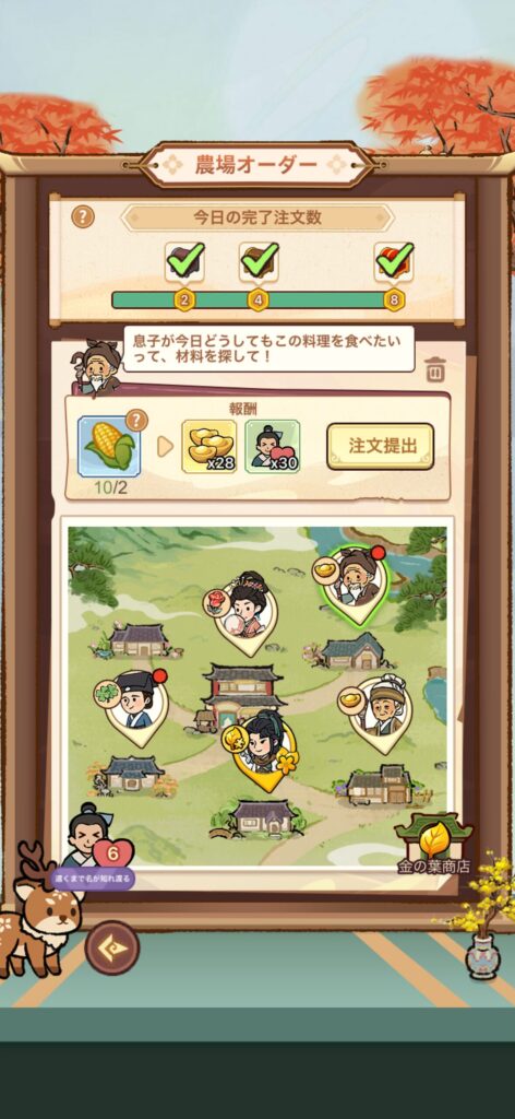 裏庭では農作物を畑で育てて、住民に納品できます。住民の返礼として、店員を雇用するための元玉や、店員をアップグレードするためのバラが入手できます。クローバーや「金の葉の欠けら」といった他の報酬は必要ないので、元玉やバラがない場合は、ひたすら注文を削除し、新しい注文を受けましょう(筆者がポイ活に挑んだ2026年1月12日時点では、注文は無限にリセットできました。ただし、10分間のリフレッシュ時間が必要です)