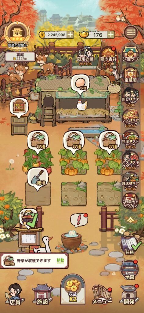 - 農作物の種を動画広告を視聴してゲットする(銅貨で種をゲットするのは普通の宿屋3条件を達成してからでよい)