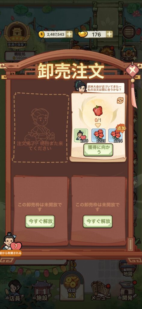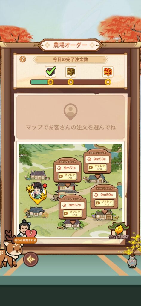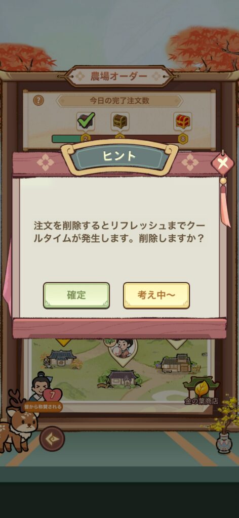 - 納品時の報酬に元玉とバラがない場合は、注文を削除して新しい注文を受ける(注文をうけるときの画面右上のゴミ箱を押せば削除できます)