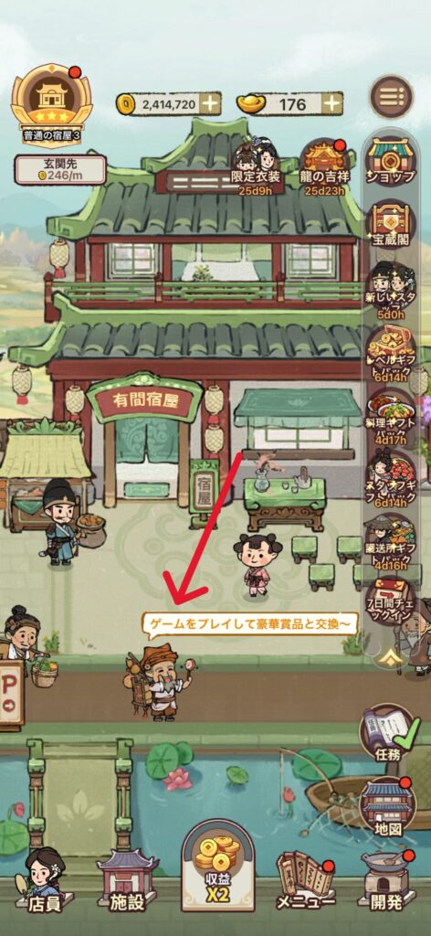| ② | 「玄関先」のゲーム屋で交換 | 2種類のゲームをプレイしてポイントで交換 「金魚すくい」の方がポイントが高い |