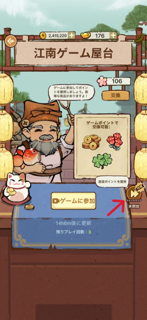 「玄関先」ではゲームをプレイして、バラと交換できます。ゲーム回数は毎日5回でき、無課金でもクイッククリアは1日1回使用できます(350pt)。残り4階は金魚すくいをやりましょう(MAX330pt)。カードめくりは運が絡むのでやらない方が良いです。