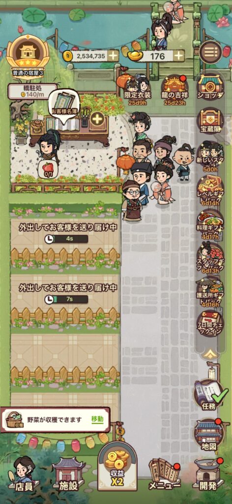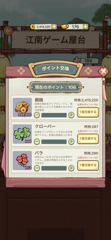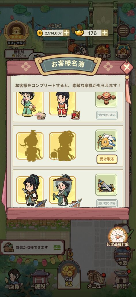 また車駐処では、ルーレットを銅貨で回してお客様を解放できます。お客様が揃うと施設の効率や評価を高める家具をゲットできるので、銅貨に余裕があればやりましょう。