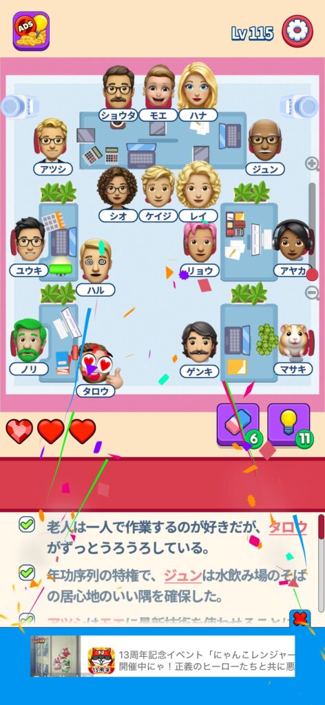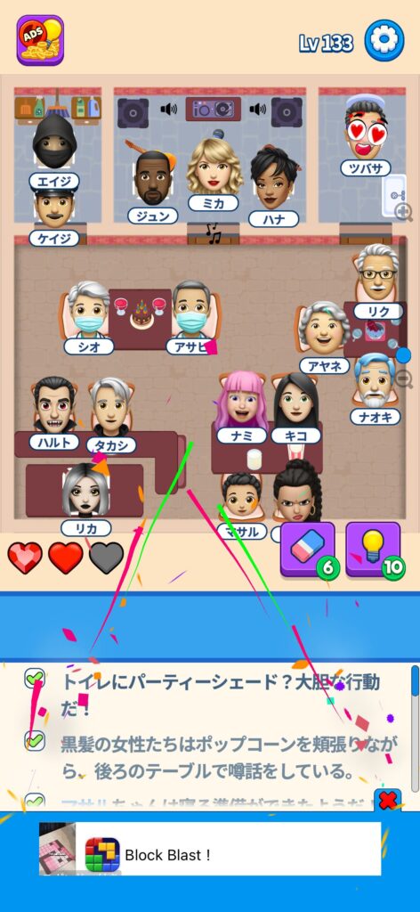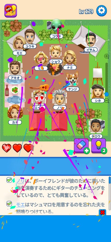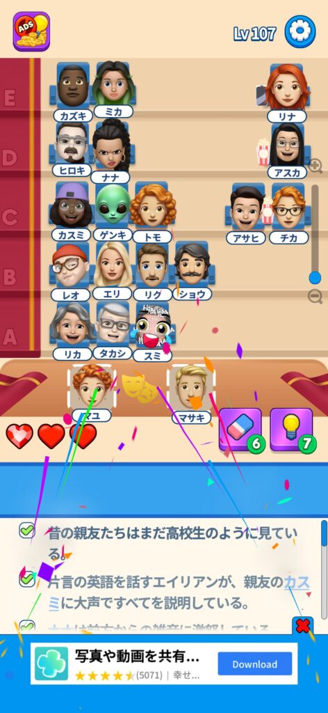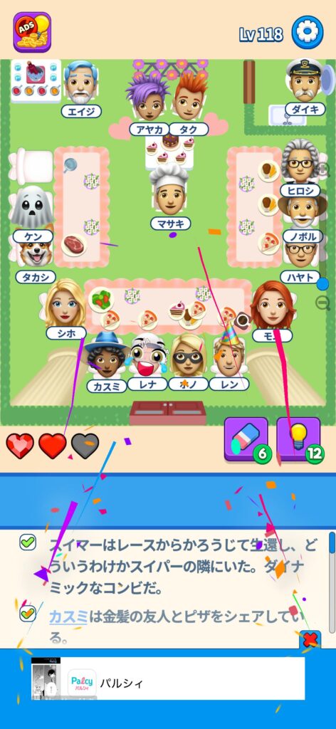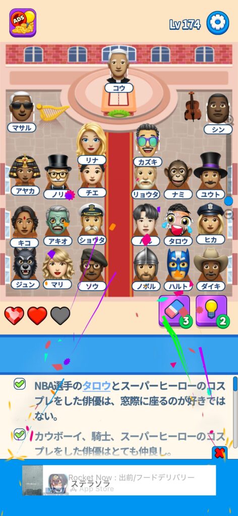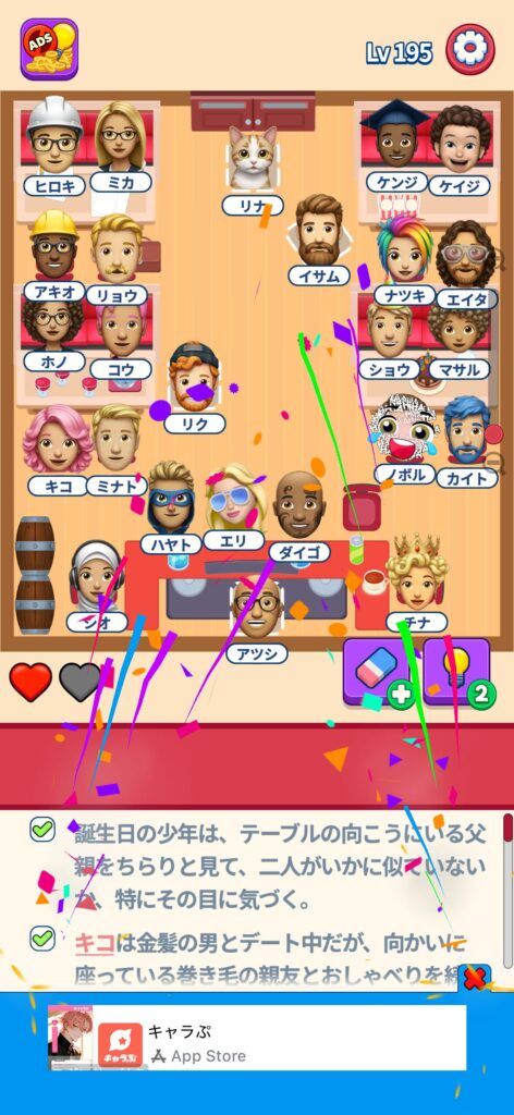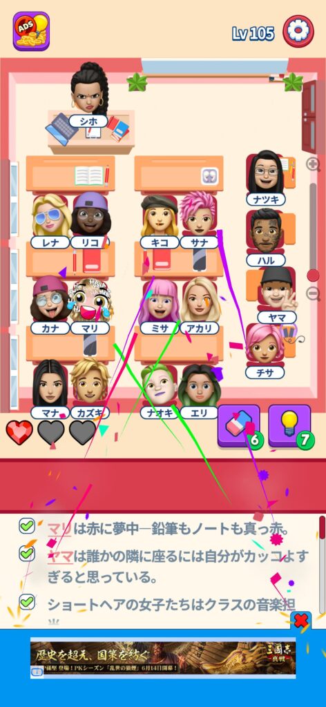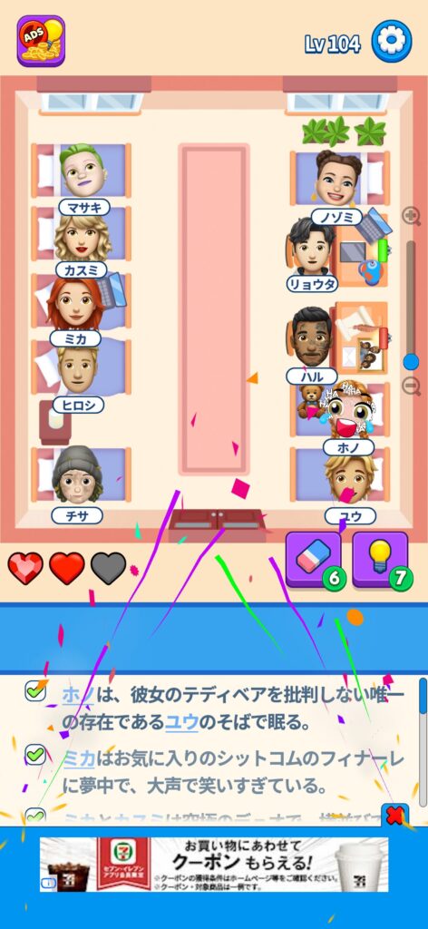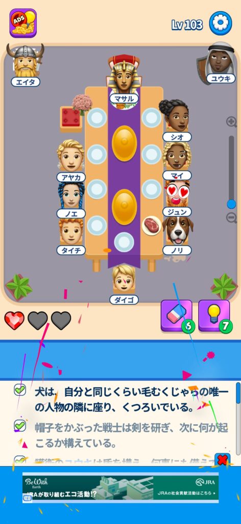 席に配置するキャラの名前はランダムですが、姿形は統一されているようです。どうしても解けない場合は参考にしてください。