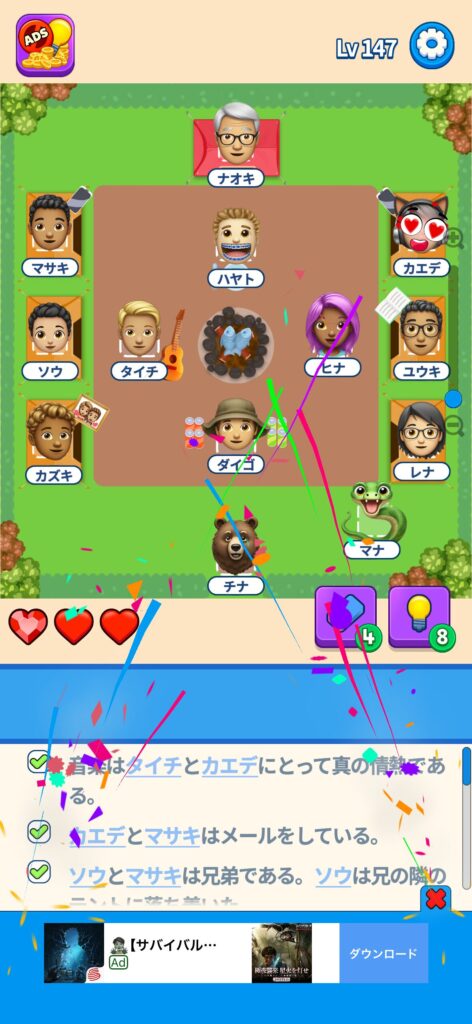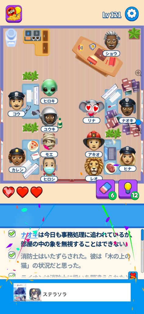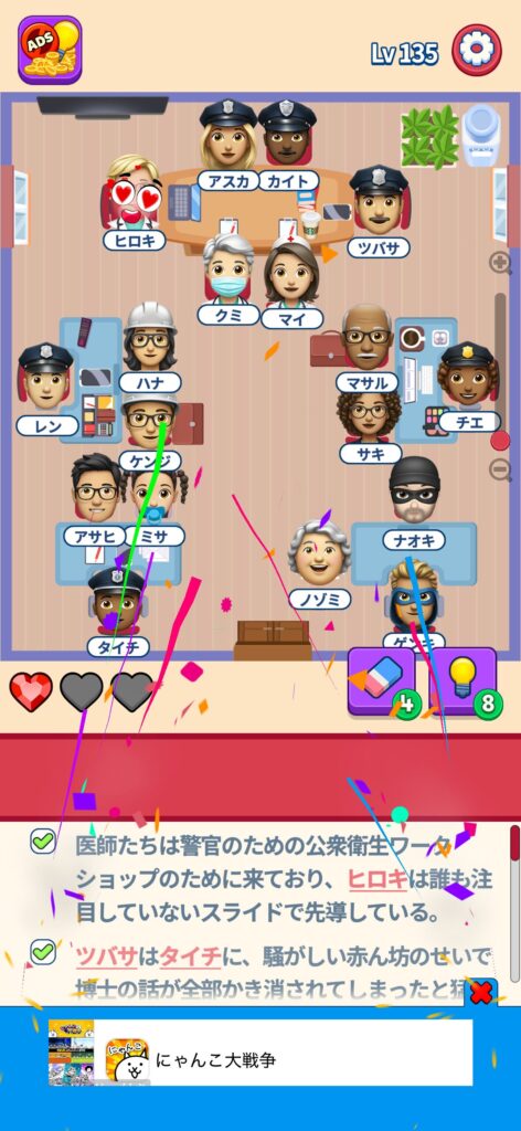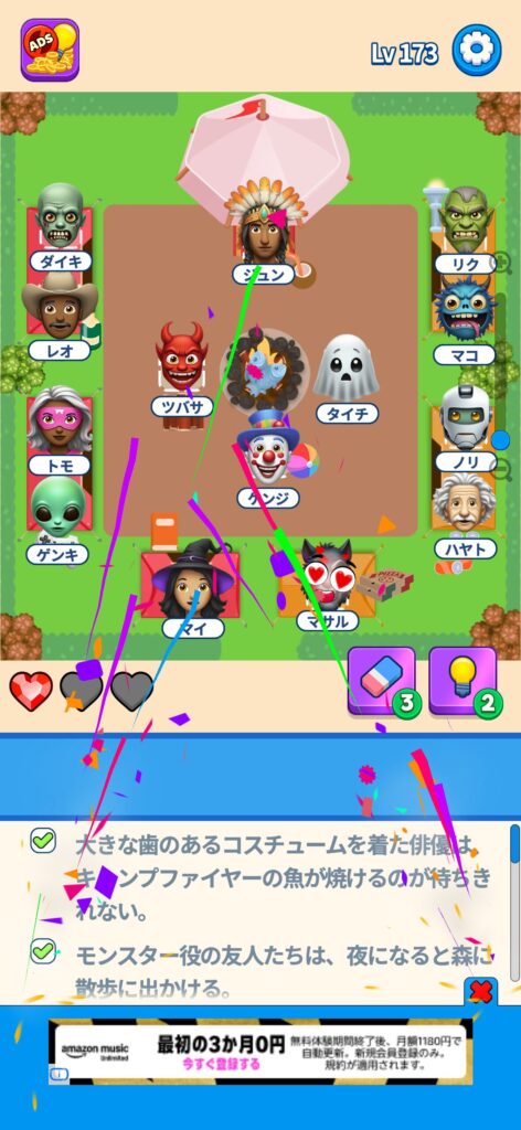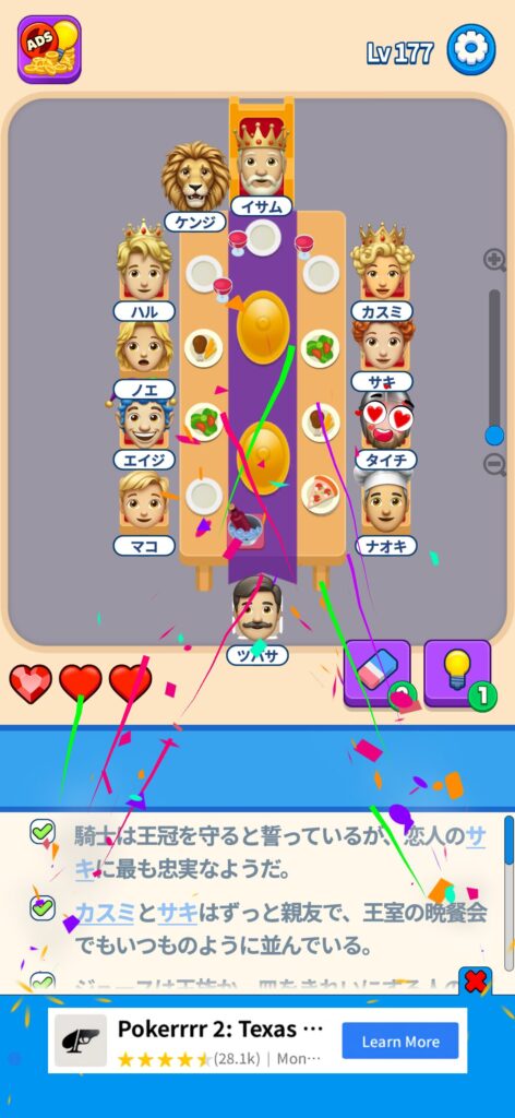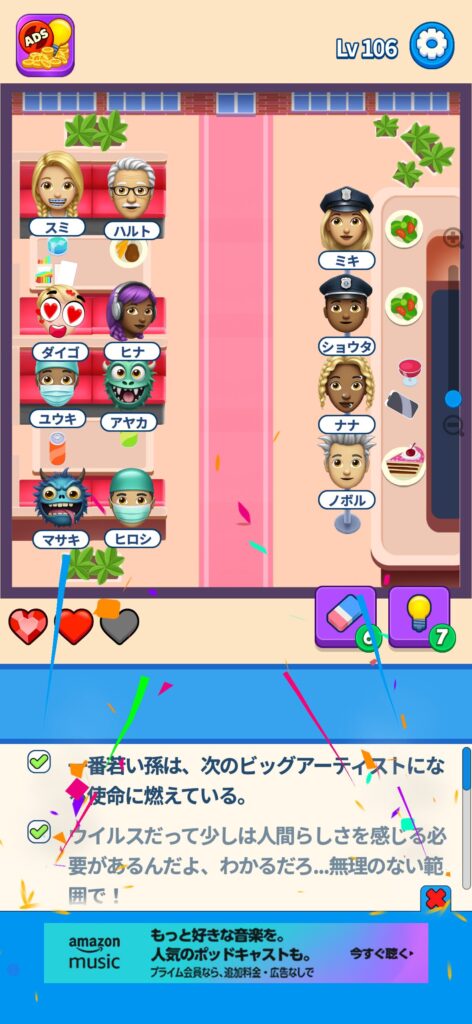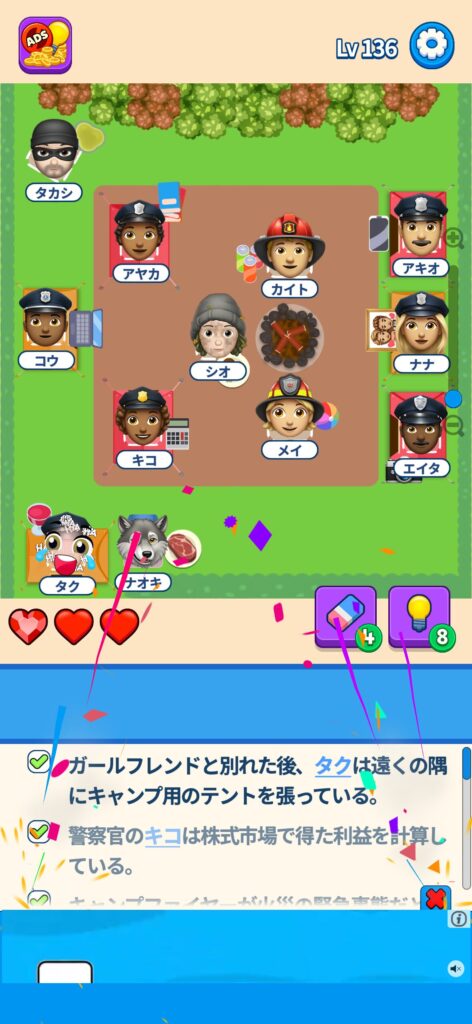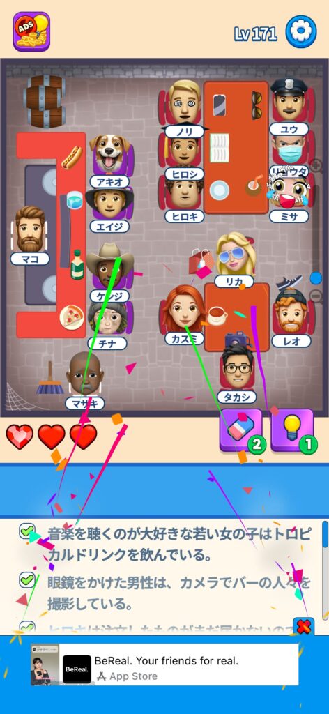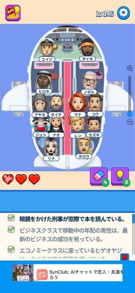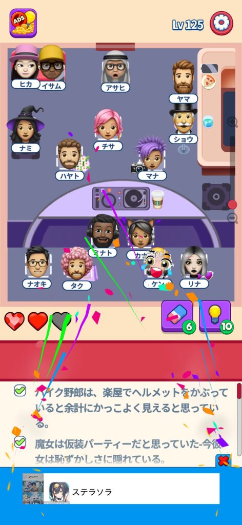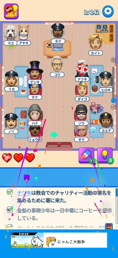 席に配置するキャラの名前はランダムですが、姿形は統一されているようです。どうしても解けない場合は参考にしてください。