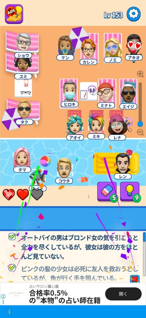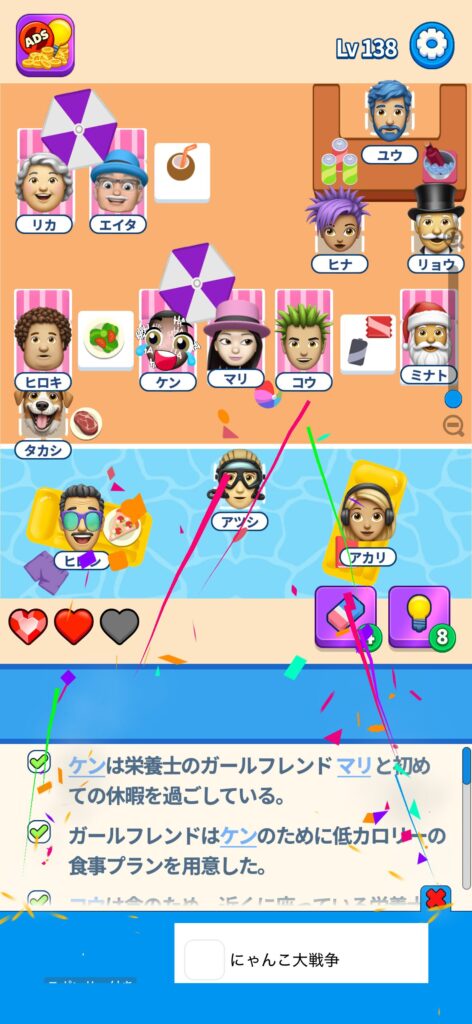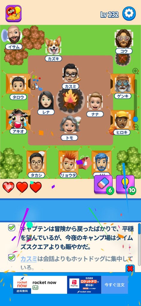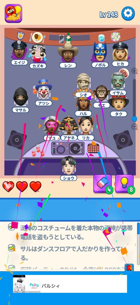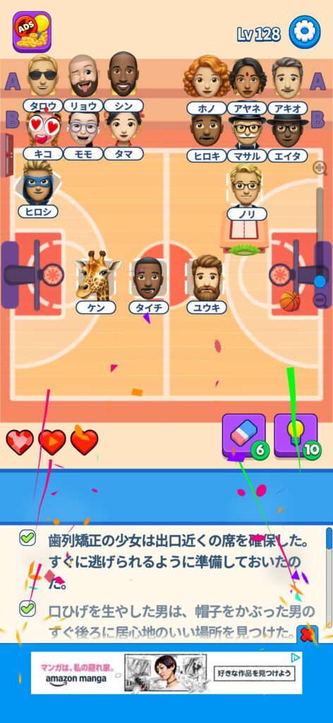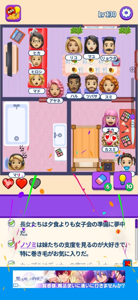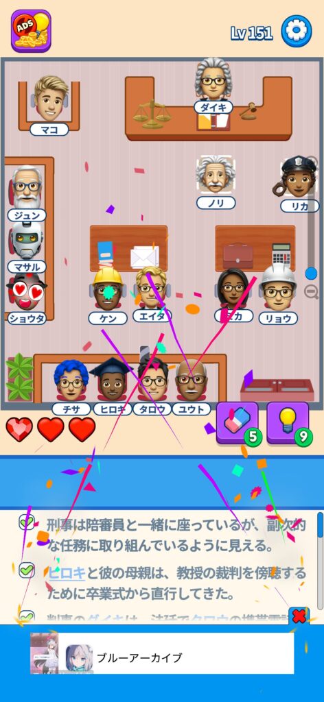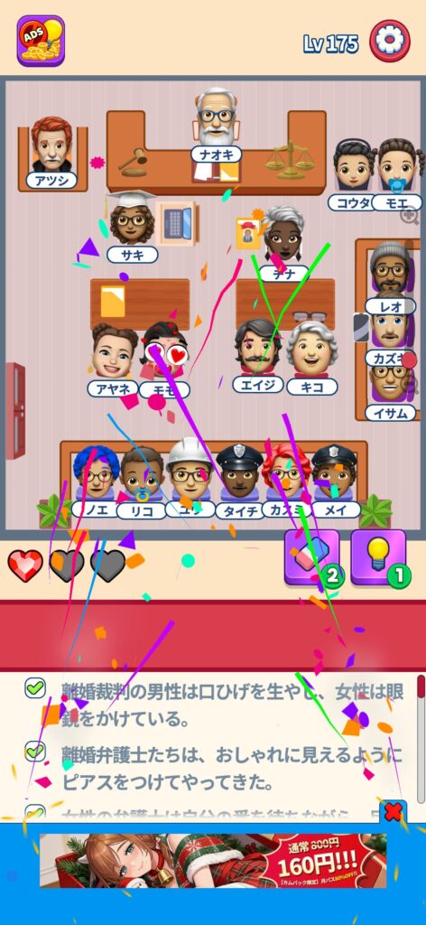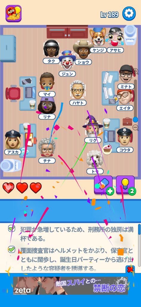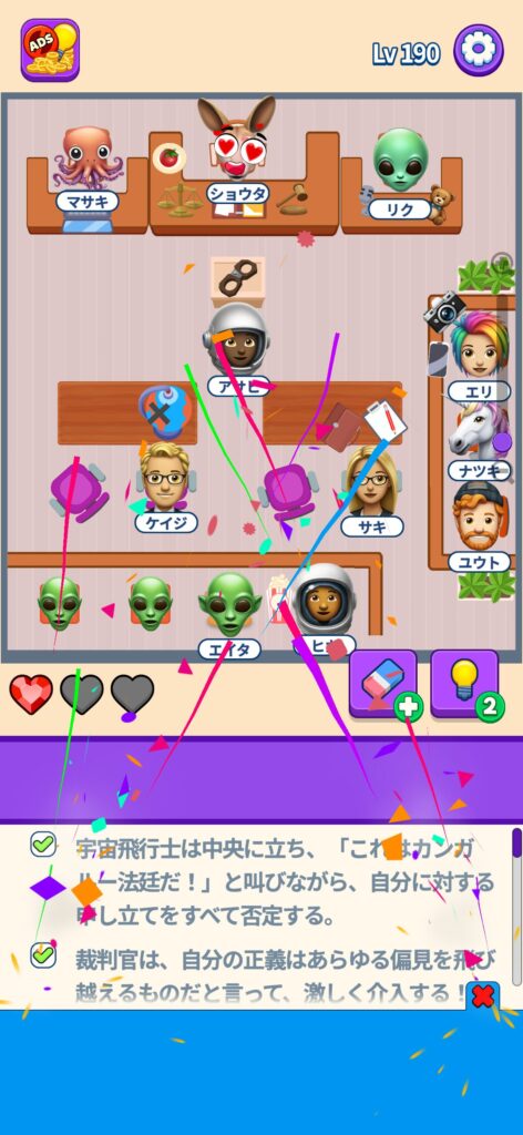席に配置するキャラの名前はランダムですが、姿形は統一されているようです。どうしても解けない場合は参考にしてください。