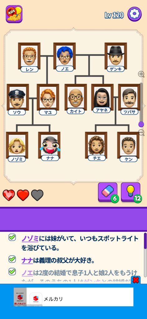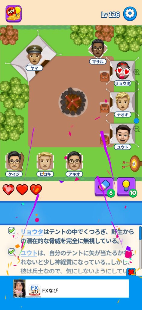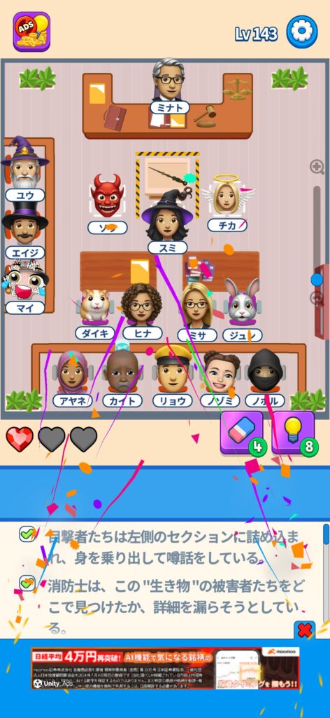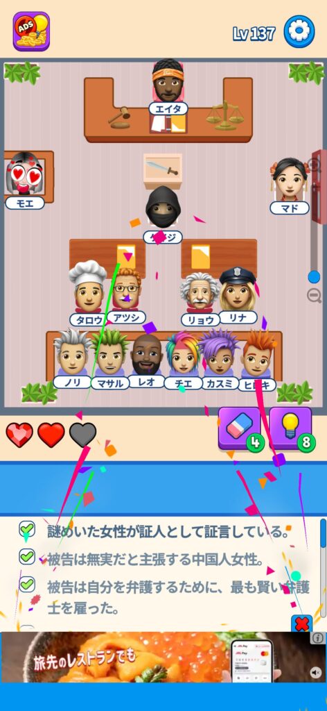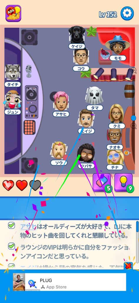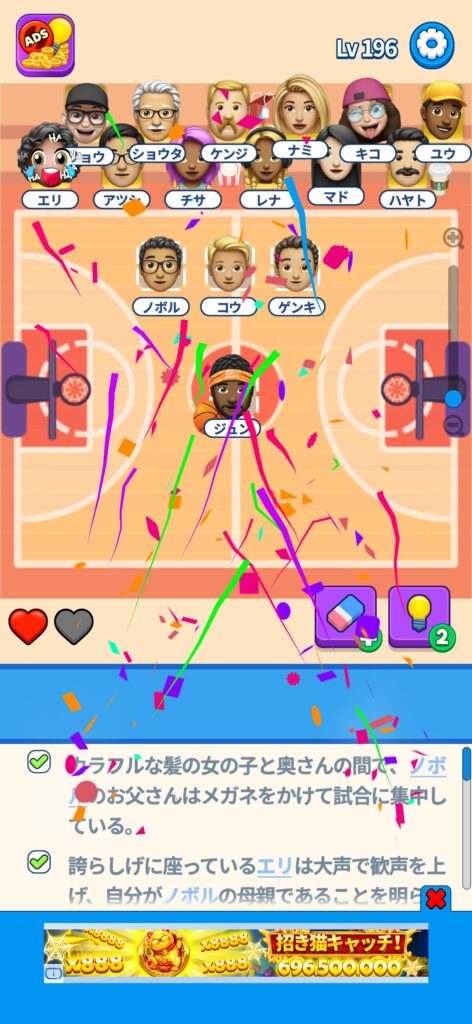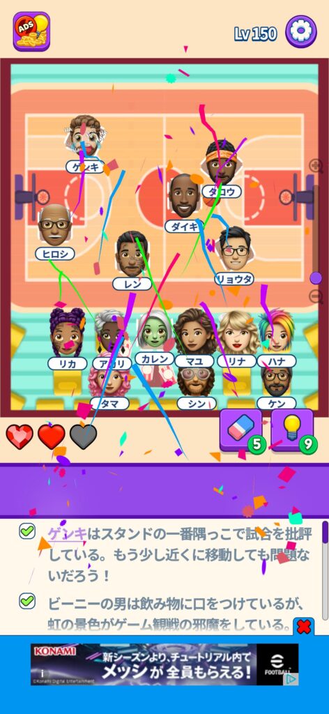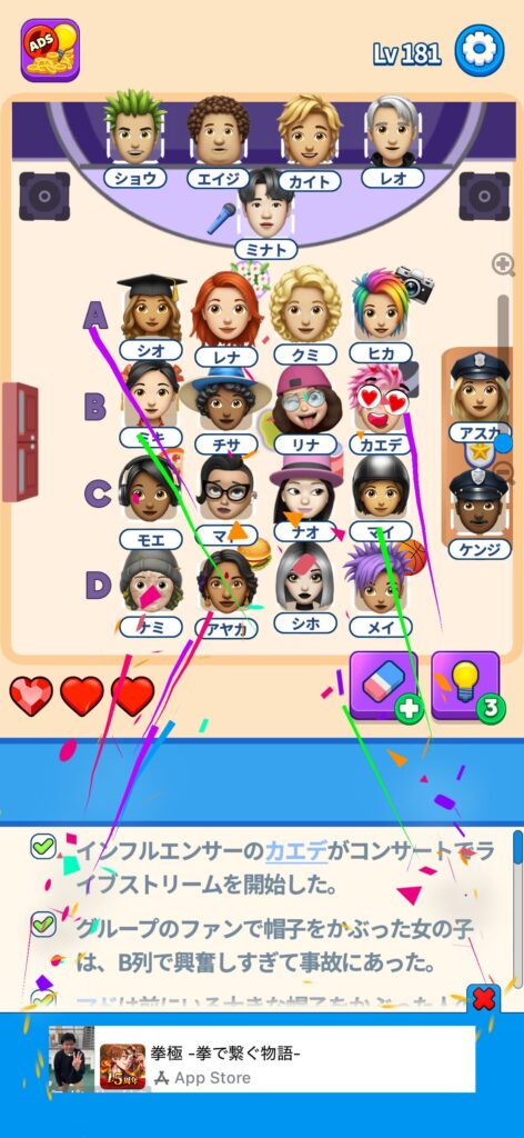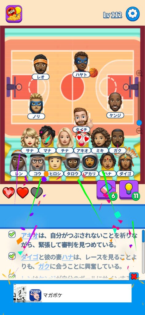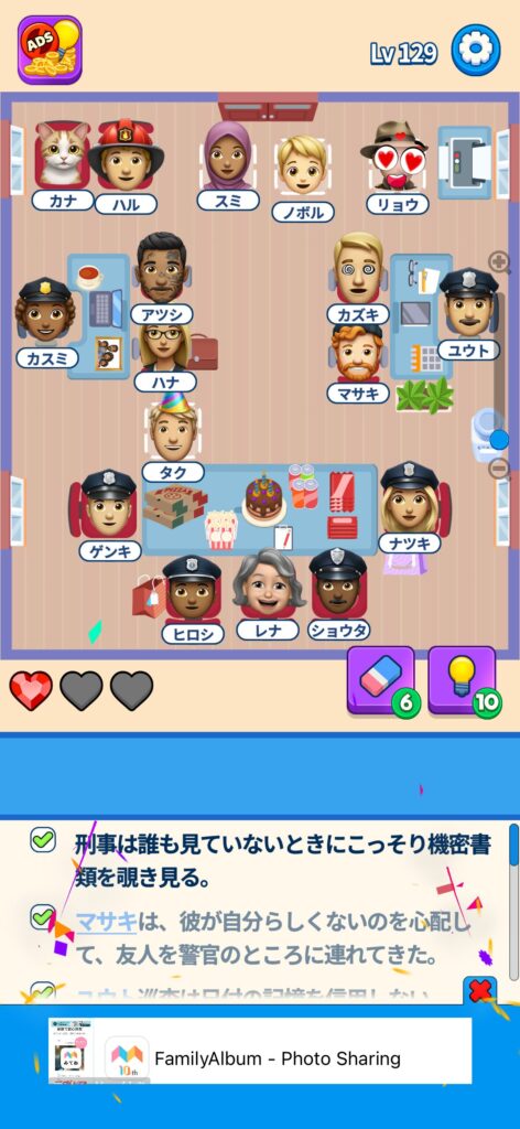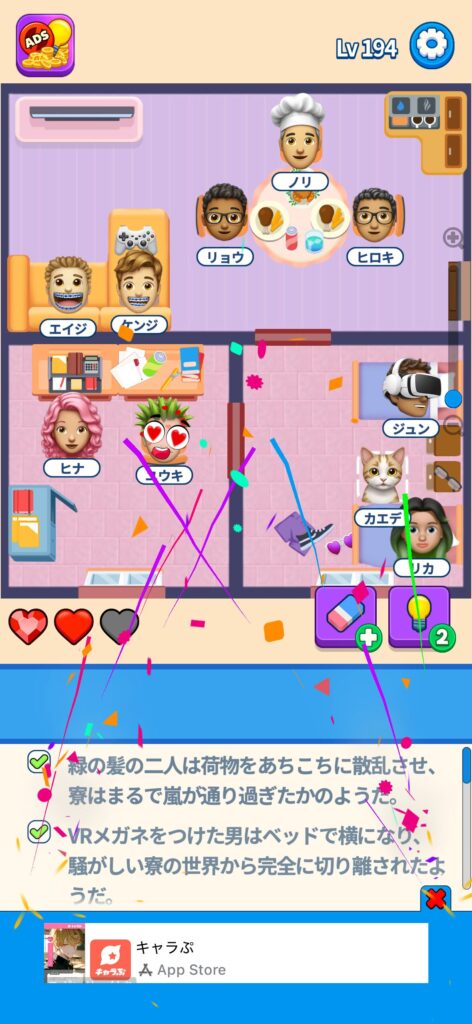 席に配置するキャラの名前はランダムですが、姿形は統一されているようです。どうしても解けない場合は参考にしてください。