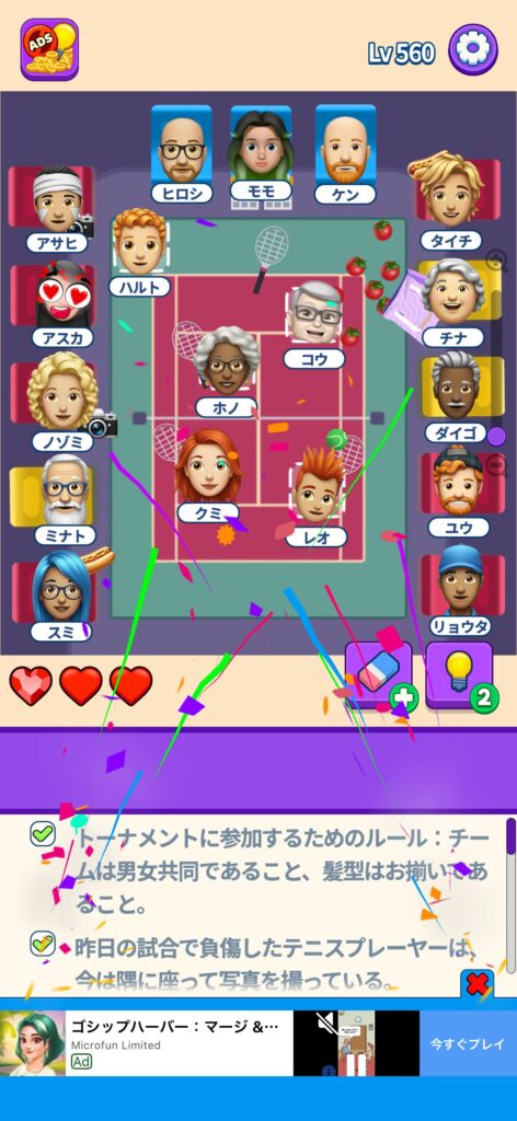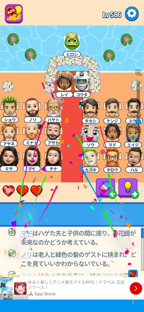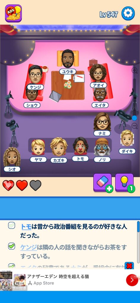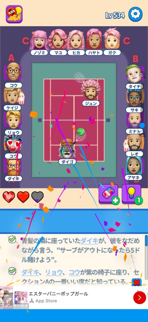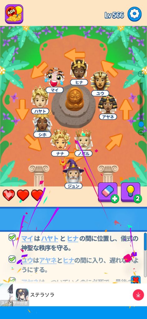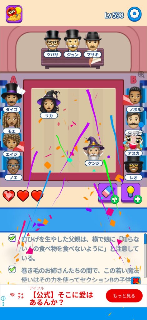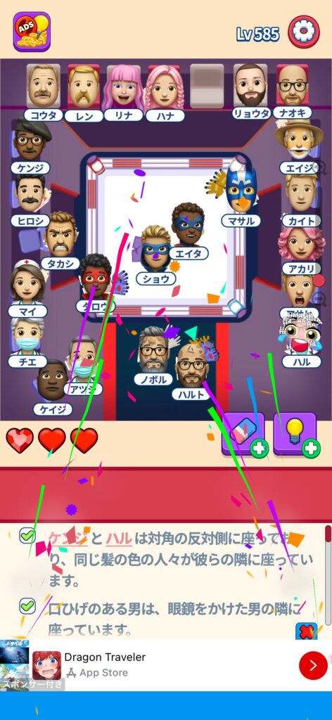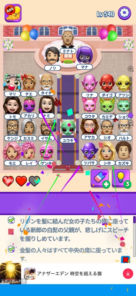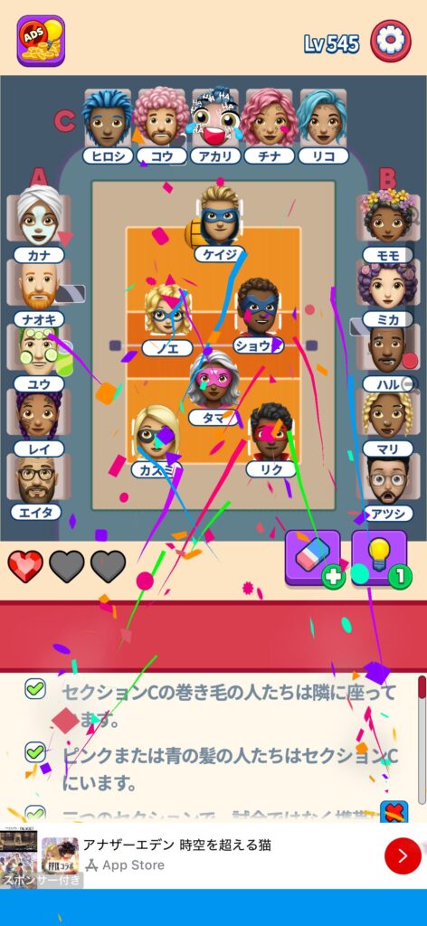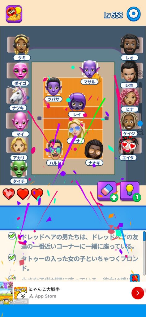 席に配置するキャラの名前はランダムに変わる仕様ですが、姿形は統一されているようです。どうしても解けない場合は参考にしてください。