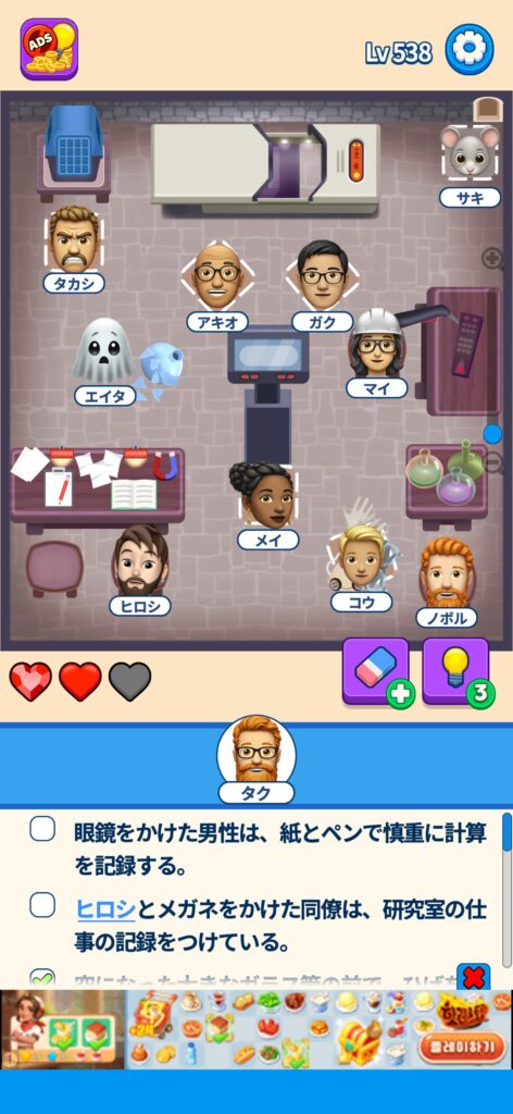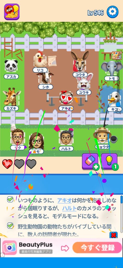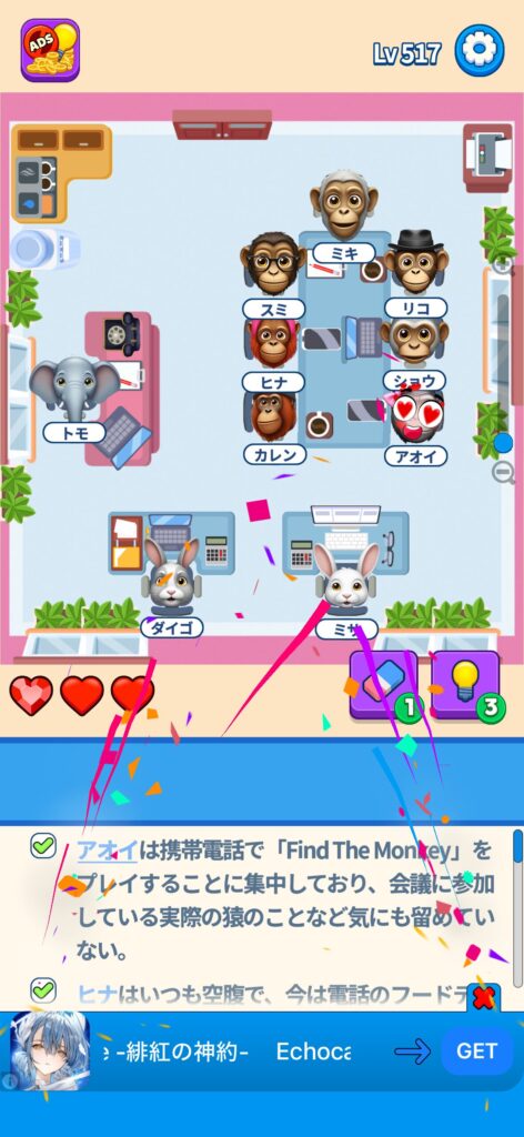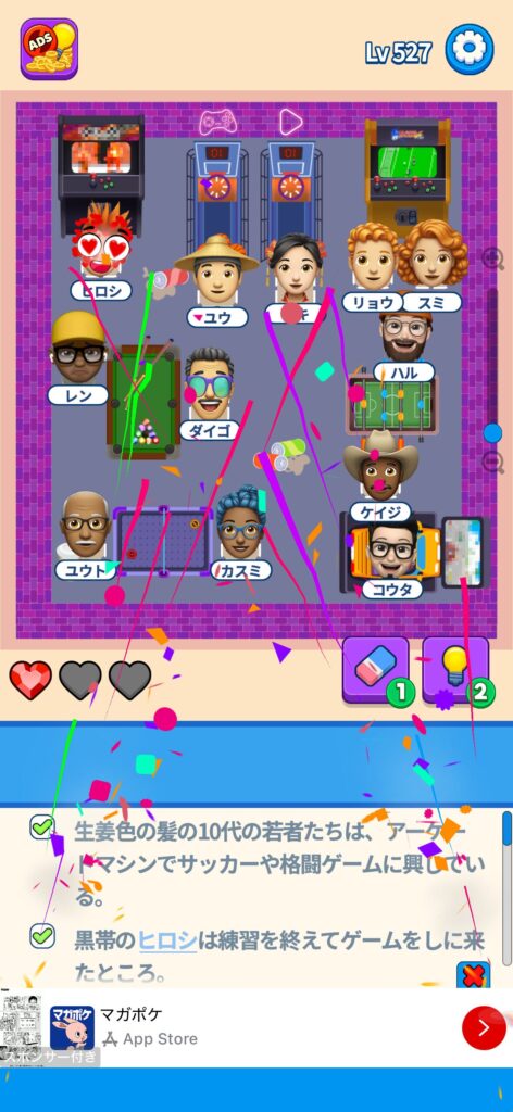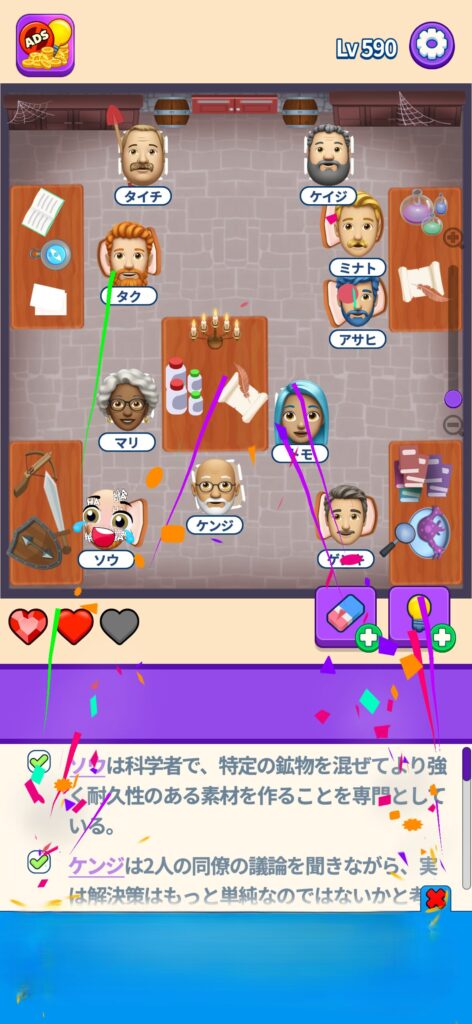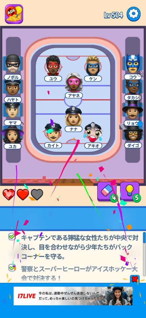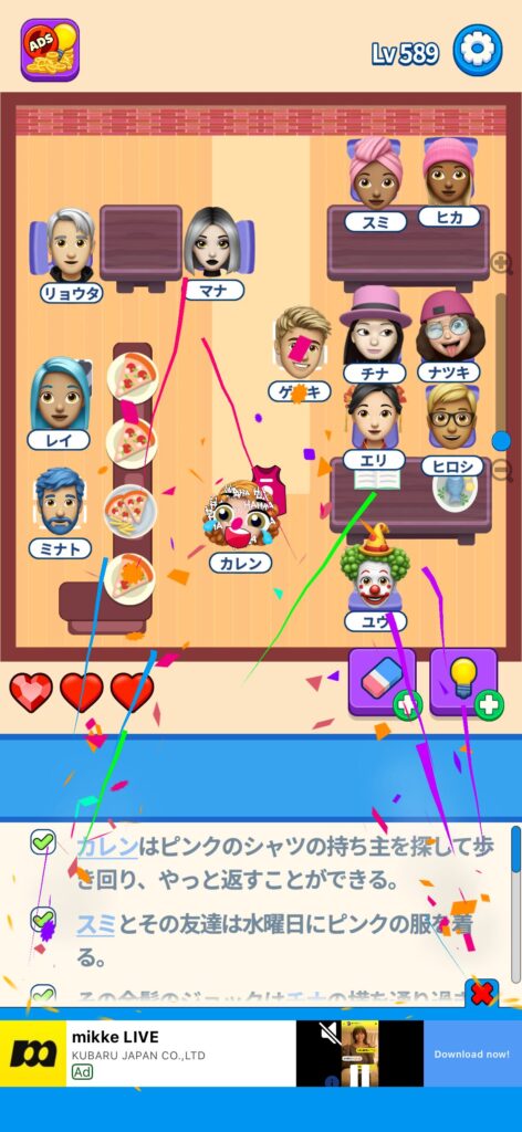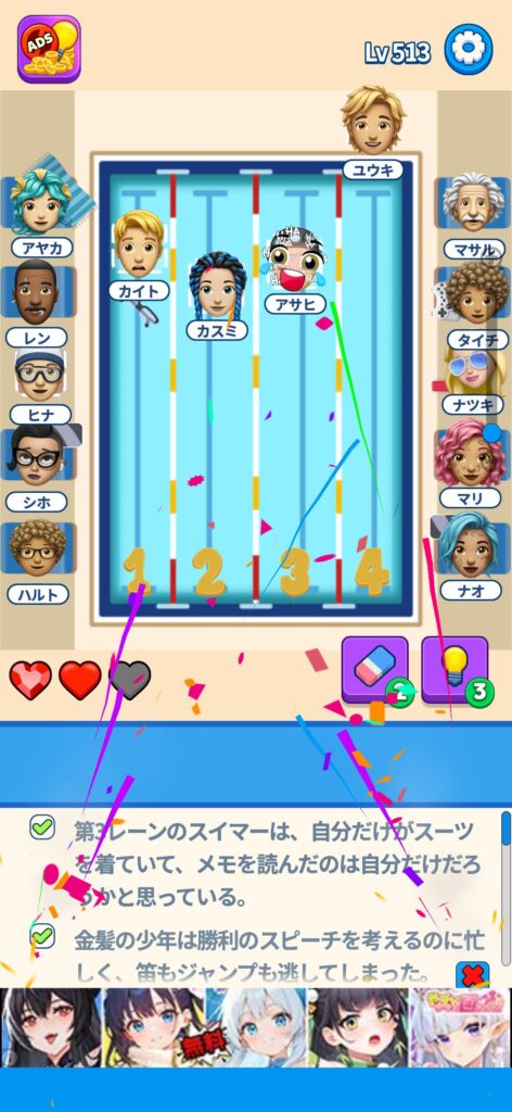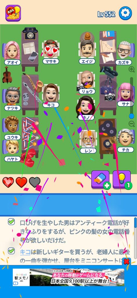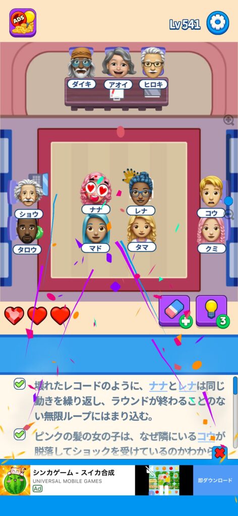 席に配置するキャラの名前はランダムに変わる仕様ですが、姿形は統一されているようです。どうしても解けない場合は参考にしてください。